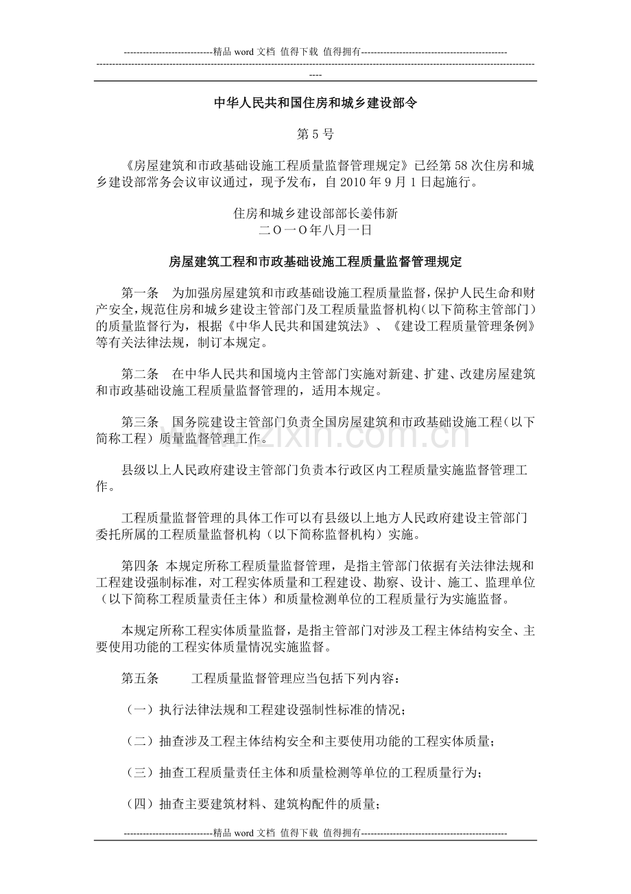 《房屋建筑和市政基础设施工程质量监督管理规定》已经第58次住房和城乡建设部常务会议审议通过,现予发布,自2010年9月1日起施行。