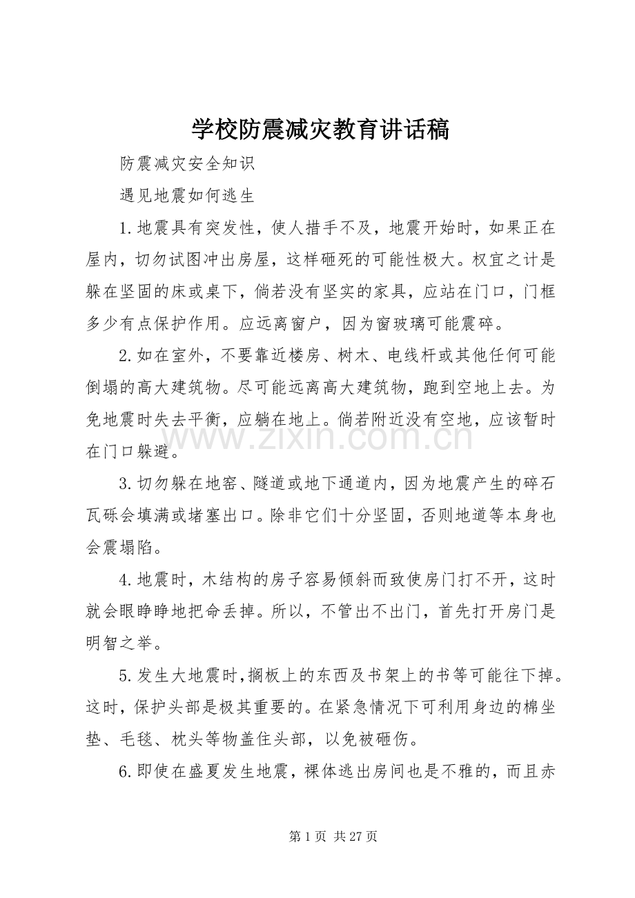 学校防震减灾教育讲话稿