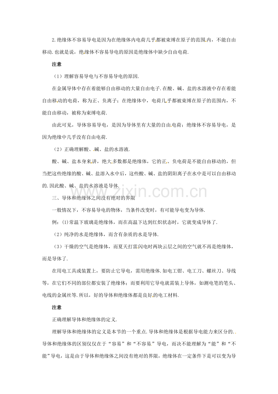 2.绝缘体不容易导电是因为在绝缘体内电荷几乎都被束缚在原子的范围内,不能自由移动.也就是说,绝缘体不容易导电的原因是绝缘体中缺少自由电荷.