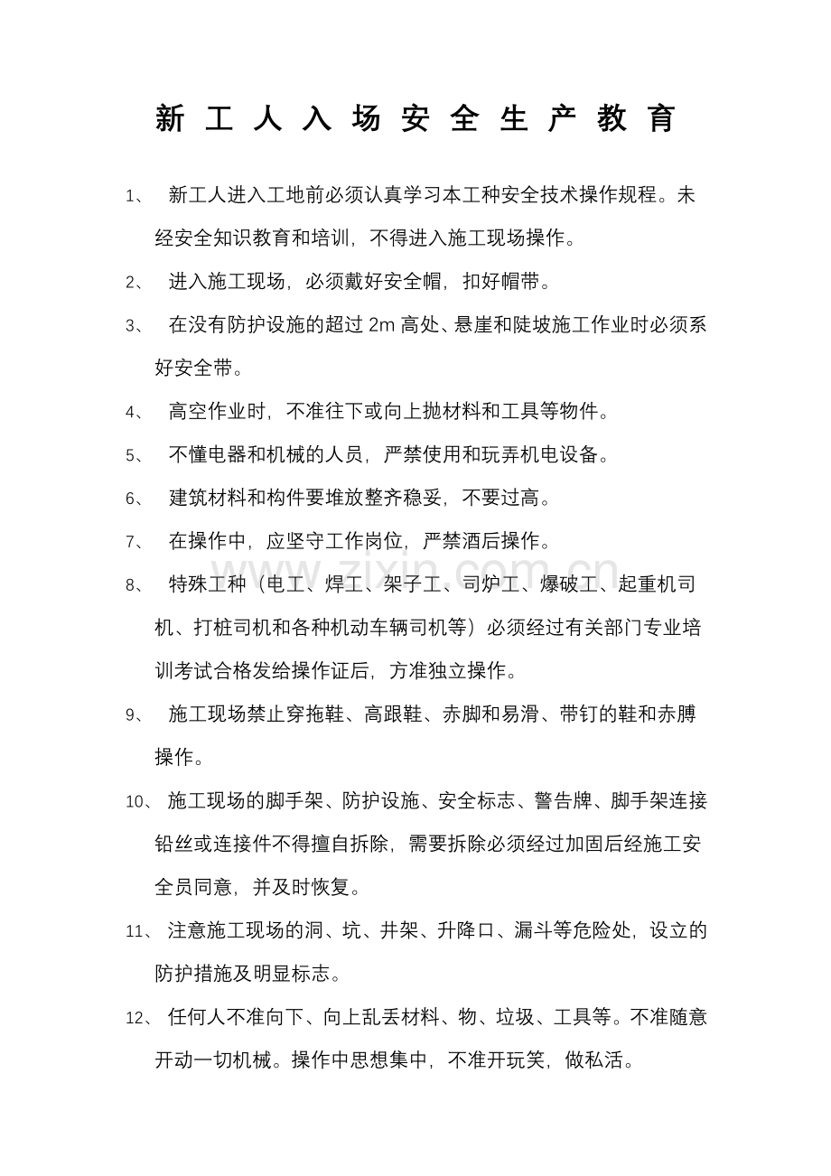 1、 新工人进入工地前必须认真学习本工种安全技术操作规程。未经安全知识教育和培训,不得进入施工现场操作。