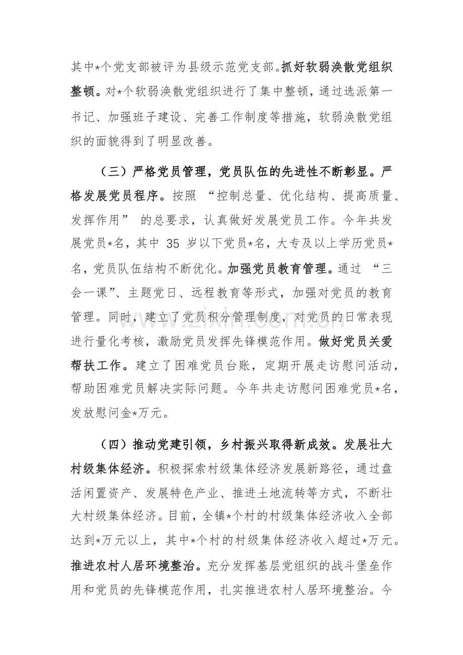 (四)推动党建引领,乡村振兴取得新成效。发展壮大村级集体经济。积极探索村级集体经济发展新路径,通过盘活闲置资产、发展特色产业、推进土地流转等方式,不断壮大村级集体经济。目前,全镇*个村的村级集体经济收入全部达到*万元以上,其中*个村的村级集体经济收入超过*万元。推进农村人居环境整治。充分发挥基层党组织的战斗堡垒作用和党员的先锋模范作用,扎实推进农村人居环境整治。今年共拆除危旧房屋*间,清理垃圾*吨,整治河道*公里,农村人居环境得到了明显改善。加强乡村治理。建立了 “一核多元” 的乡村治理体系,以基层党组织为核心,充分发挥村民自治组织、社会组织、志愿服务组织等多元主体的作用,共同参与乡村治理。同时,加强了对农村矛盾纠纷的排查化解,今年共调处矛盾纠纷*起,维护了农村社会稳定。