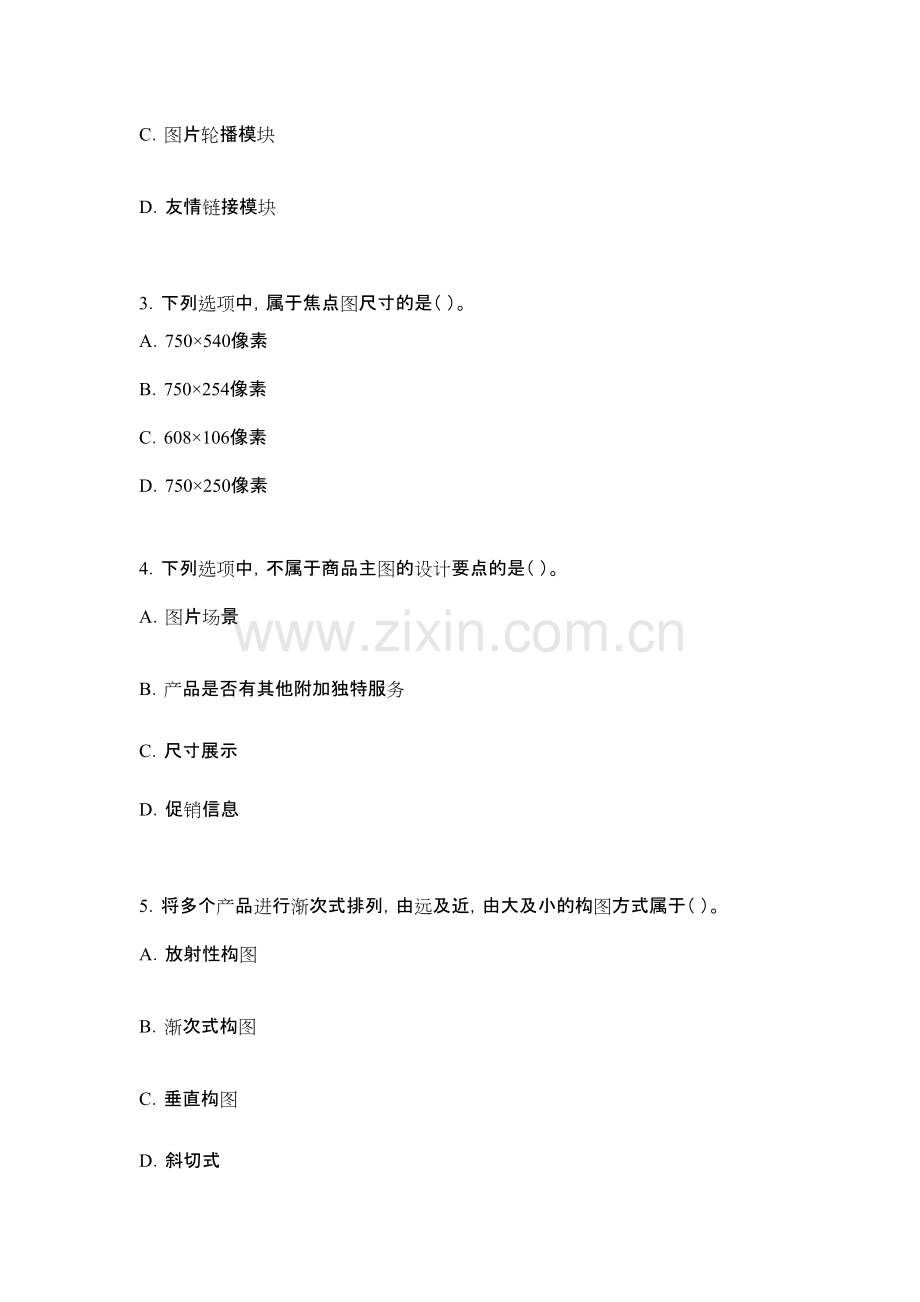 网店美工实战教程(全彩微课版 第2版)试卷班级:_姓名:_一、填空题 (共5题,每题1分。)1_作为吸引消费者的第一步,一般放置于商品详情页的最前端。2_主要是对商品的使用方法、材质、细节、产品介绍等内容进行展示。3按_组合键可复制当前选择的图层。4当商品照片较为灰暗、模糊时,很难展示商品的质感,此时可通过_滤镜增加图片清晰度来提高图片的质感。5_是指色彩的相貌,_是指色彩的纯度,_是指色彩的明暗程度。二、单项选择题 (共20题,每题1分。)1让平淡的画面变得更加饱满,使拍摄物体现出良好的影像光感的摄影装置是( )。A无线引闪器B柔光箱C闪光灯D反光板2哪种模块对热销产品的销量进行排序( )。A商品推荐模块B商品排行模块C图片轮播模块D友情链接模块3下列选项中,属于焦点图尺寸的是( )。A750540像素B750254像素C608106像素D750250像素4下列选项中,不属于商品主图的设计要点的是( )。A图片场景B产品是否有其他附加独特服务C尺寸展示D促销信息5将多个产品进行渐次式排列,由远及近,由大及小的构图方式属于( )。A放射性构图B渐次式构图C垂直构图D斜切式6在图形3要素中,( )在视觉形态中可以表现长度、宽度、位置、方向性和性格,具有刚柔并济、优美和简洁的特点。A点B线C面D图像7以文字为主要表现方式的海报的特点是( )、直观可读,被广泛应用。A直接表现B形象C信息明确D产生直觉记忆效果8在色彩的选择中,恰当的( )可以产生光感、明快感、清晰感,使画面展现的效果更加美观。A纯度对比B明度对比C冷暖色对比D色彩面积对比9一张完整的优惠券除了优惠面额,还需要留意很多信息,下列选项中不属于优惠券的设计要点的是( )。A优惠券的使用范围B优惠券的使用条件C优惠券的使用时间限制D优惠券的尺寸大小10常规店招的一般尺寸为( )。A1920150像素B950150像素C950120像素D750120像素11对于图片大小的修改,以下说法正确的是( )。A图片的像素只建议改小,不建议改大,因为图片放大会导致模糊B图片的修改,可以将图的尺寸改大或改小,对效果不影响C图片只建议小图改成大图,不建议改小D图片只能剪切,不能改大小的12主图视频建议时长是( )。A19秒B2030秒C560秒D1120秒13下列选项中,不属于进入素材中心方法的是( )。A通过卖家中心进入B使用网页直接进入C使用千牛进入D直接搜索素材中心进入14电商海报设计中的字体设计需要遵守的一个基本原则是( )。A文字内容从商品内容出发B保证文字的可读性C字体风格的多样化D字体设计的造型统一15在店铺装修过程中,( )页面形象的要素之一。A文字B图片C海报D链接16下列选项中,关于主图图片尺寸和要求说法错误的是( )。A主图可以是310310像素的图片B主图可以是800800像素的图片C主图一般可以上传46个不同角度的图片D主图中没有尺寸的限制17通常称为“构成三要素”的是:( )。A点、线、面B明度、纯度、肌理C位置、空间、重心D概念、关系、视觉18色相对比中的“邻近色对比”是指在色相环上0-( )度之间的色彩差别对比所呈现的色彩构成效果。A120B90C60D3019将文字选中,单击文字工具属性栏中的 按钮,可打开( )对话框。A艺术样式B变换C变形文字D曲线20详情页建议时长不超过( )。A1分钟B2分钟C5分钟D10分钟三、多项选择题 (共20题,每题2分。)1网店美工的工作范畴包含哪些内容( )。A打造店铺特色B美化商品图片C美化商品图片D设计活动页面2下列选项中,属于单反相机的拍摄模式的是( )。A手动曝光模式B快门优先自动曝光模式C光圈优先自动曝光模式D全自动曝光模式3下面对网店美工实战教程中常用的字体布局技巧的叙述,正确的有( )A选择34种匹配度高的字体可以达到良好的视觉效果B文字的字体、粗细、大小和颜色在搭配组合上让买家有一种关联的感觉C按重要程度设置文本的显示级别,引导买家浏览文案的顺序D可利用字体、粗细、大小与颜色的对比来设计文本的显示级别4素材中心的优势是( )。A安全稳定B管理方便C便于识别D管理方便5下列选项中,符合智钻图设计要求的有( )。A因地制宜B目标明确C主题突出D丰富细节6下列选项中,符合智钻图设计标准的有( )。A主图突出B目标明确C形式美观D丰富细节7色相对比还分为( )。A原色对比B补色对比C间色对比D邻近色对比8在素材中心中图片显示方式有( )。A图标式B图例式C竖向列表式D横向列表式9在海报设计中,更改文本显示与组合的方式有( )。A设置字体B设置字号C设置字体颜色D编辑文字笔画10下列选项中,符合智钻图设计的尺寸要求的有( )。A520280像素B640200像素C375130像素D580320像素11能否快速打动消费者是直通车图是否成功引流的关键,下面属于直通车引流手段的有( )。A走差异化路线B使用一些噱头C使用包邮D展示大众好评数据12色彩有( )基本属性。A色相B明度C纯度D光泽度13下列选项中属于商品视频拍摄的步骤是( )。A了解商品的特点B道具和场景的选择C视频的拍摄D后期的合成14下列选项中,属于让主图在淘宝搜索页的众多主图中成功吸引买家眼球的技巧是( )。A卖点清晰有创意B商品的大小适中C产品数量多D丰富细节15文案的前期准备有哪些( )。A从基本信息中找到卖点B借鉴他人效果C了解同行信息D准备资料16直通车的构图方式很多,包括中心构图、三角构图、斜角构图、黄金比例构图等,但总体上要求符合消费者的( )视觉流程。A从左至右B从上至下C先图后文D先中间后两边17与电脑