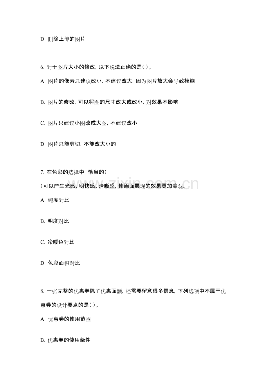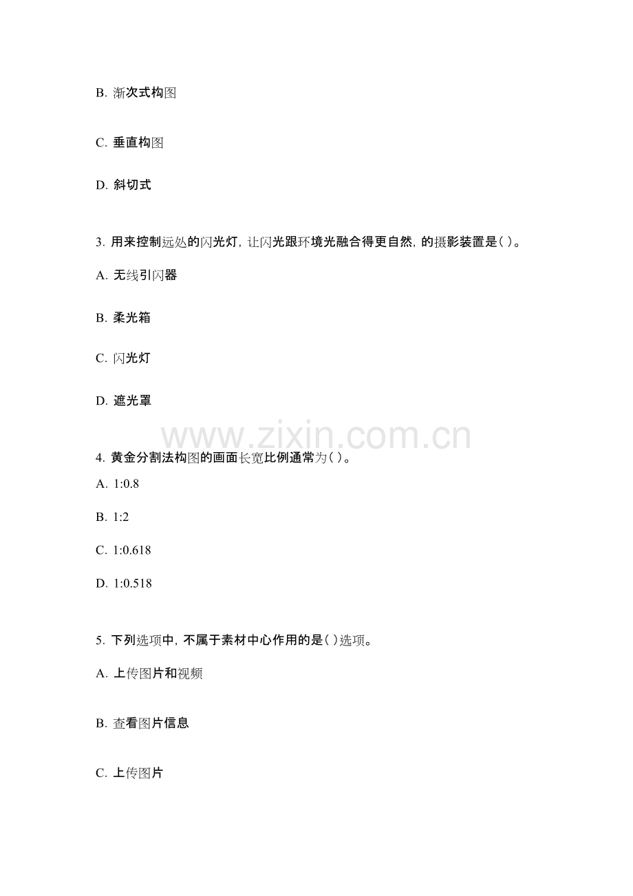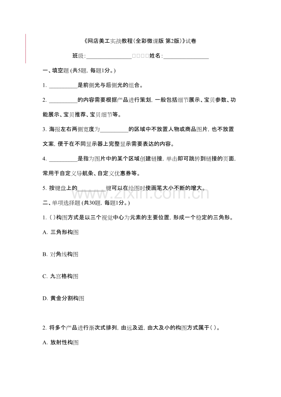 网店美工实战教程(全彩微课版 第2版)试卷班级:_姓名:_一、填空题 (共5题,每题1分。)1_是前侧光与后侧光的组合。2_的内容需要根据产品进行策划,一般包括细节展示、宝贝参数、功能展示、宝贝推荐、宝贝细节等。3海报左右两侧宽度为_的区域中不放置人物或商品图片,也不放置文案,便于在不同显示器上完整显示需要表达的内容。4_是指为图片中的某个区域创建链接,单击即可跳转到链接的页面,常用于自定义导航条、自定义优惠券等。5按键盘上的_键可以在绘图时使画笔大小不断的增大。二、单项选择题 (共30题,每题1分。)1( )构图方式是以三个视觉中心为元素的主要位置,形成一个稳定的三角形。A三角形构图B对角线构图C九宫格构图D黄金分割构图2将多个产品进行渐次式排列,由远及近,由大及小的构图方式属于( )。A放射性构图B渐次式构图C垂直构图D斜切式3用来控制远处的闪光灯,让闪光跟环境光融合得更自然,的摄影装置是( )。A无线引闪器B柔光箱C闪光灯D遮光罩4黄金分割法构图的画面长宽比例通常为( )。A1:0.8B1:2C1:0.618D1:0.5185下列选项中,不属于素材中心作用的是( )选项。A上传图片和视频B查看图片信息C上传图片D删除上传的图片6对于图片大小的修改,以下说法正确的是( )。A图片的像素只建议改小,不建议改大,因为图片放大会导致模糊B图片的修改,可以将图的尺寸改大或改小,对效果不影响C图片只建议小图改成大图,不建议改小D图片只能剪切,不能改大小的7在色彩的选择中,恰当的( )可以产生光感、明快感、清晰感,使画面展现的效果更加美观。A纯度对比B明度对比C冷暖色对比D色彩面积对比8一张完整的优惠券除了优惠面额,还需要留意很多信息,下列选项中不属于优惠券的设计要点的是( )。A优惠券的使用范围B优惠券的使用条件C优惠券的使用时间限制D优惠券的尺寸大小9色相对比中的“邻近色对比”是指在色相环上0-( )度之间的色彩差别对比所呈现的色彩构成效果。A120B90C60D3010Photoshop默认情况下,前景色和背景色分别为( )。A黑色和红色B红色和白色C黄色和白色D黑色和白色11下列选项中,关于主图图片尺寸和要求说法错误的是( )。A主图可以是310310像素的图片B主图可以是800800像素的图片C主图一般可以上传46个不同角度的图片D主图中没有尺寸的限制12主图视频建议时长是( )。A19秒B2030秒C560秒D1120秒13下列选项中,不属于商品详情页的设计要点的是( )。A引发兴趣、激发潜在需求B赢得消费者信任C帮助消费者查找产品D替顾客做决定14A文案不单单只是将文字添加到对应的板块中,还需要对一些要点进行策划分析,使其应用于页面中,下列选项中不属于文案策划相关知识的是( )。A从文案的受众群体进行策划B从文案的目的进行策划C从文案的主题进行策划15哪种构图方式,常用于长条的或者竖立的商品( )。A竖线构图B横线构图C直线构图D斜线构图16适应消费者的能力是指( )。A美工宣传店铺的能力B美工通过图片准确地向消费者表达出商品的特点并挖掘潜在消费者需求的能力C美工促销能力D美工展示商品的能力17在photoshop中制作电商海报,主要内容一般放在( )像素之内。A1024B880C950D192018以文字为主要表现方式的海报的特点是( )、直观可读,被广泛应用。A直接表现B形象C信息明确D产生直觉记忆效果19让平淡的画面变得更加饱满,使拍摄物体现出良好的影像光感的摄影装置是( )。A无线引闪器B柔光箱C闪光灯D反光板20详情页建议时长不超过( )。A1分钟B2分钟C5分钟D10分钟21绘制路径后,按( )组合键将绘制的路径转换为选区。AShift+EnterBCtrl+EnterCAlt+EnterDCtrl+Shift+I22通栏店招的具体尺寸为( )。A1920150像素B950120像素C1920540像素D950130像素23在图形3要素中,( )在视觉形态中可以表现长度、宽度、位置、方向性和性格,具有刚柔并济、优美和简洁的特点。A点B线C面D图像24下列选项中,( )选项不属于网店美工的技能要求。A熟练使用Photoshop、Flash、Fireworks、Dreamweaver等常用设计与制作软件B具备扎实的美术功底和独到的创新思维C精通网页设计语言D能够良好运营店铺25哪种模块主要用于搜索商品( )。A商品推荐模块B商品排行模块C宝贝搜索模块D友情链接模块26将文字选中,单击文字工具属性栏中的 按钮,可打开( )对话框。A艺术样式B变换C变形文字D曲线27当发现素材中心中图片对应的产品已经下架,此时可将该图片( )。A删除B编辑C移动D重命名28下列选项中,不属于商品主图的设计要点的是( )。A图片场景B产品是否有其他附加独特服务C尺寸展示D促销信息29哪种构图方式,能使画面产生宁静、宽广、稳定、可靠的感觉( )。A竖线构图B横线构图C直线构图D斜线构图30在Photoshop中,如果一张照片的结果不够清晰,可用( )滤镜弥补。A中间值B锐化C风格化D去斑三、多项选择题 (共15题,每题2分。)1下列选项中,属于单反相机的拍摄模式的是( )。A手动曝光模式B快门优先自动曝光模式C光圈优先自动曝光模式D全自动曝光模式2网店在经营剃须刀、鼠标、电脑等科技型产品时,可添加下列哪些效果来增加立体感和科技感( )。A阴影效果B外发光效果C内发光效果D光泽效果3文案的前期准备有哪些( )。A从基本信息中找到卖点B借鉴他人效果C了解同行信息D准备资料4色相对比还分为( )。A原色对比B补色对比C间色对比D邻近色对比5能否快速打动消费者是直通车图是否成功引流的关键,下面属于直通车引流手段的