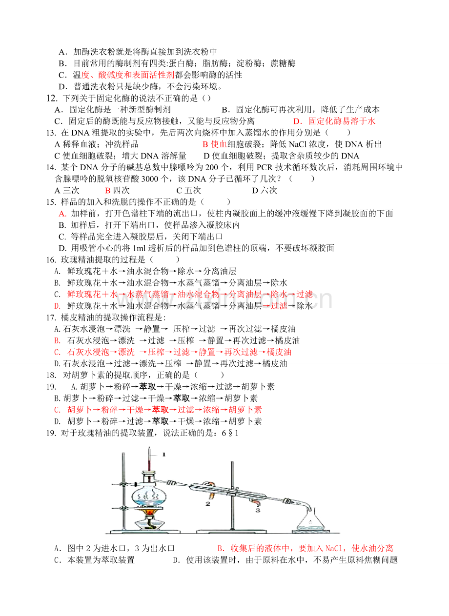 C.提取胡萝卜素时,可采用石油醚、苯、丙酮等作溶剂 D.萃取过程中要采用水浴加热