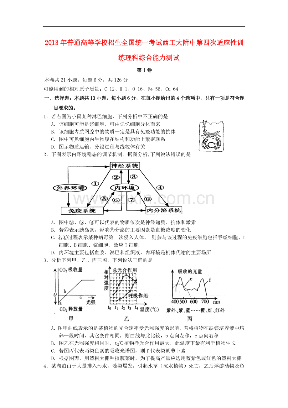 2013年普通高等学校招生全国统一考试西工大附中第四次适应性训练理科综合能力测试
