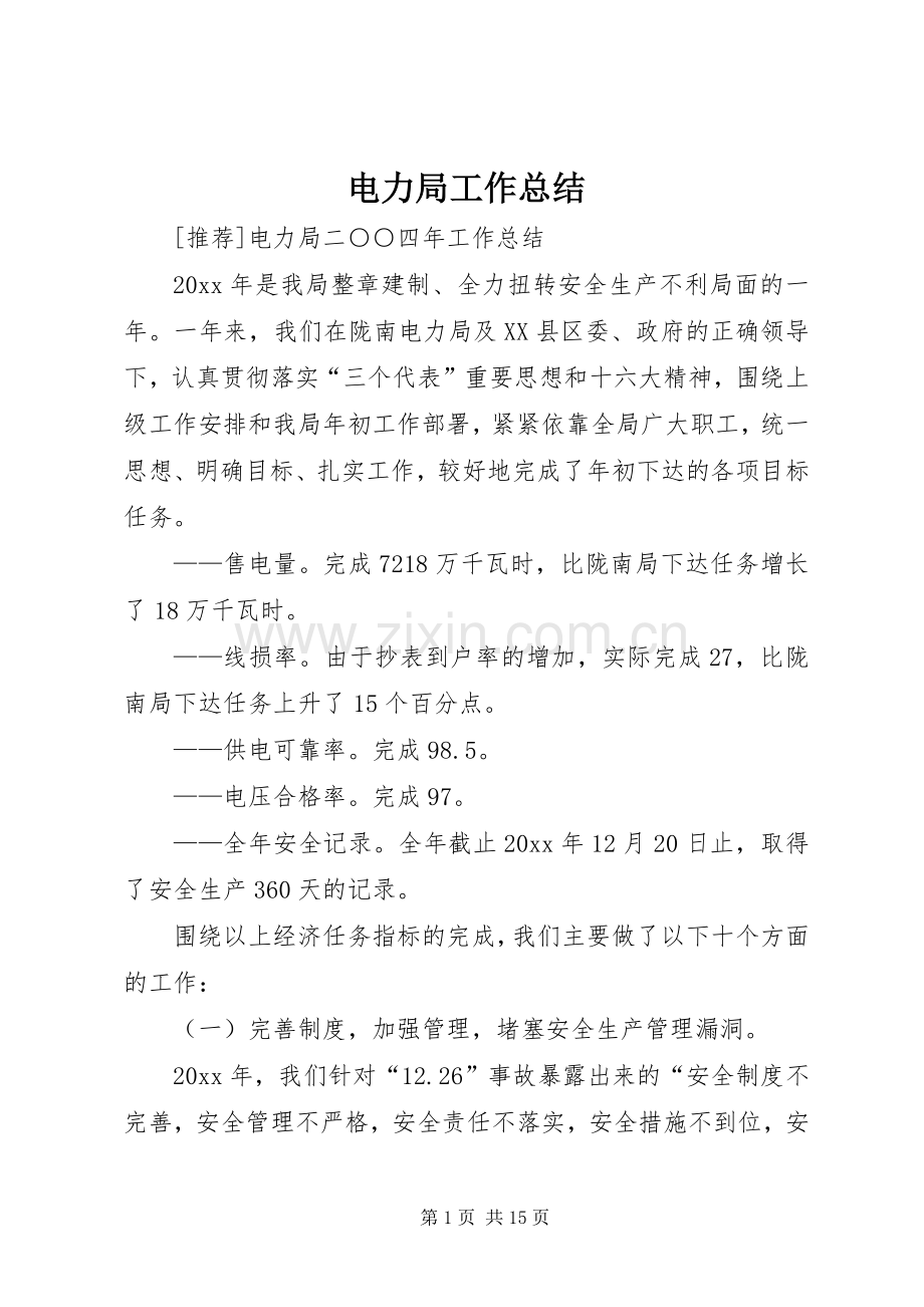 20xx年是我局整章建制、全力扭转安全生产不利局面的一年。一年来,我们在陇南电力局及XX县区委、政府的正确领导下,认真贯彻落实“三个代表”重要思想和十六大精神,围绕上级工作安排和我局年初工作部署,紧紧依靠全局广大职工,统一思想、明确目标、扎实工作,较好地完成了年初下达的各项目标任务。