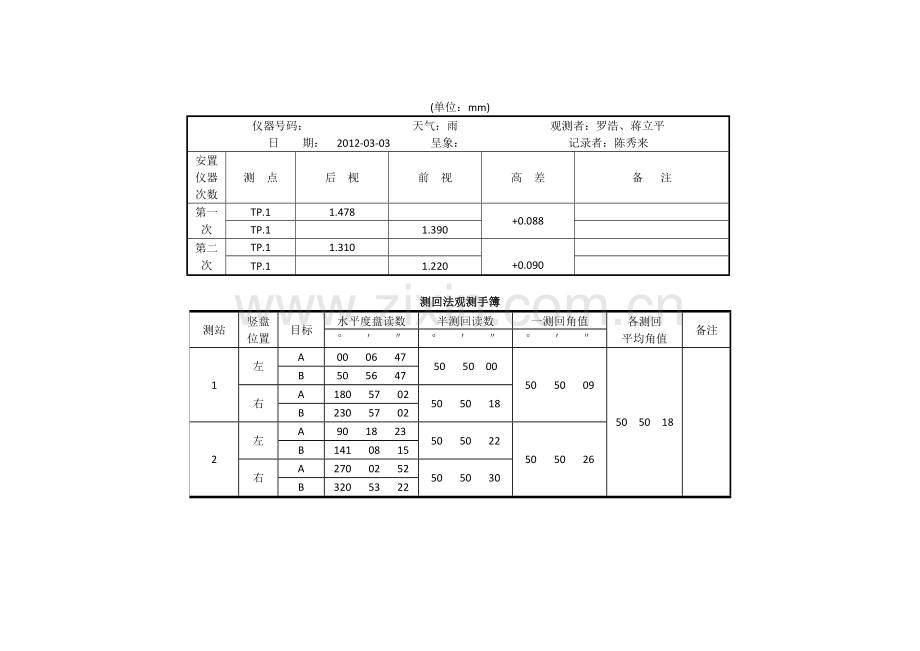 全圆方向观测法测水平角记录表
