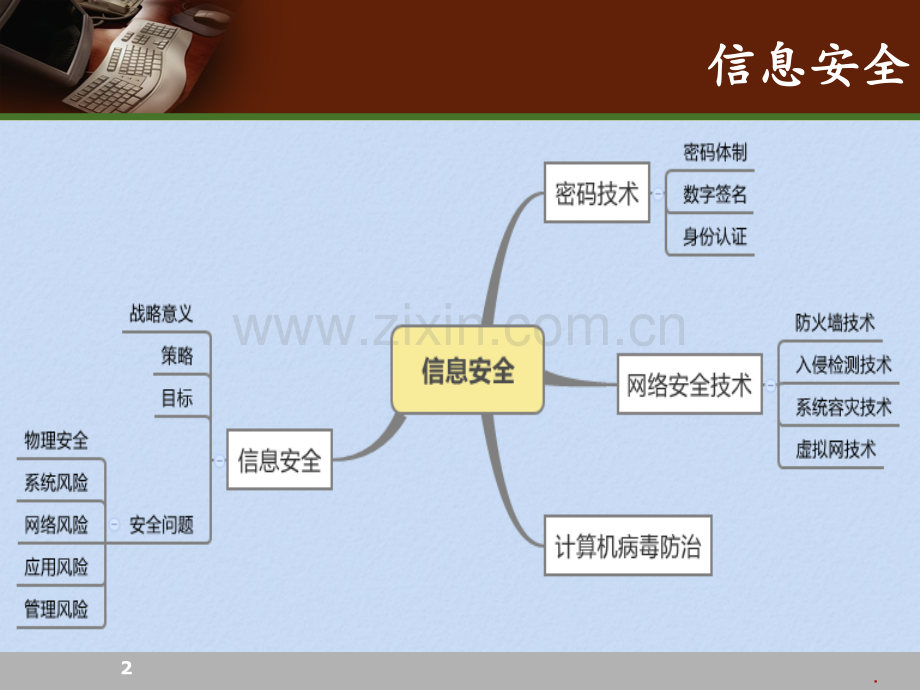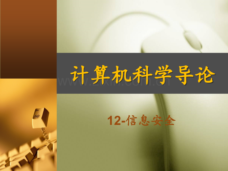 计算机科学导论计算机科学导论12-信息安全信息安全2 信息安全信息安全.3 信息安全信息安全.信息安全基础信息安全基础在信息时代,信息安全可理解为保障信息的机密在信息时代,信息安全可理解为保障信息的机密性、完整性、可用性、真实性、可控性,防御和性、完整性、可用性、真实性、可控性,防御和对抗在信息领域威胁国家政治、经济、文化等安对抗在信息领域威胁国家政治、经济、文化等安全,而采取有效策略的过程。信息安全不仅关系全,而采取有效策略的过程。信息安全不仅关系信息自身的安全,更对国家安全具有重大战略价信息自身的安全,更对国家安全具有重大战略价值。值。信息安全基础信息安全基础信息攻击形式复杂化主动攻击:对信息的修改、删除、伪造、添加、重放、冒充和病毒入侵等;被动攻击:对信息的侦听、截获、窃取、破译和业务流量分析、电磁信息提取等。新信息技术应用引发新信息安全风险信息安全管理问题信息安全人才的培养.4信息安全面临的挑战信息安全面临的挑战信息安全基础信息安全基础技术层面的策略防火墙技术、审计技术、访问控制等管理层面的策略 法律法规、准则、标准、组织结构、管理等资源层面的策略 设备和技术资源理念层面的策略安全教育、安全意识.5保障信息安全的策略保障信息安全的策略信息安全基础信息安全基础机密性:保证信息不被非授权访问,即使非授权用户得到信息也无法知晓信息的内容,因而不能使用。完整性:维护信息的一致性,即在信息生成、传输、存储和使用过程中不应发生人为或非人为的非授权篡改。可用性:授权用户在需要时能不受其他因素的影响,方便地使用所需信息。可控性:信息在整个生命周期内都可由合法拥有者加以安全的控制。不可抵赖性:用户无法在事后否认曾经对信息进行的生成、签发、接收等行为。.6信息安全的目标信息安全的目标信息安全问题分析信息安全问题分析物理安全风险物理安全风险设备因自然灾害、人为破坏、操作失误、干扰、破坏等所致的财产损失和数据损失。系统风险系统风险硬件、软件、网络和通信协议风险网络与应用风险网络与应用风险内部操作不当、内部管理不严造成系统安全管理失控、来自外部的威胁和犯罪管理风险管理风险.7信息安全基础信息安全基础8 信息安全信息安全.密码技术密码技术密码技术是信息安全技术中的核心技术,密码技密码技术是信息安全技术中的核心技术,密码技术涉及信息论、计算机科学和密码学等多方面知术涉及信息论、计算机科学和密码学等多方面知识,它的主要任务是研究计算机系统和通信网络识,它的主要任务是研究计算机系统和通信网络内信息的保护方法以实现系统内信息的安全、保内信息的保护方法以实现系统内信息的安全、保密、真实和完整。密、真实和完整。密码密码技术技术.9密码技术的基本思想密码技术的基本思想 密码密码技术的基本思想就是伪装信息,即对信息做一定的技术的基本思想就是伪装信息,即对信息做一定的数学变换,使不知道密钥的用户不能解读其真实的含义数学变换,使不知道密钥的用户不能解读其真实的含义。变换变换之前的原始数据称为明文(之前的原始数据称为明文(plaintextplaintext),变换之),变换之后的数据称为密文(后的数据称为密文(ciphertextciphertext),变换的过程就叫做加),变换的过程就叫做加密(密(encryptionencryption),而通过逆变换得到原始数据的过程就),而通过逆变换得到原始数据的过程就称为解密(称为解密(decryptiondecryption),解密需要的条件或者信息称为),解密需要的条件或者信息称为密钥(密钥(KeyKey),通常情况下密钥就是一系列字符串。),通常情况下密钥就是一系列字符串。一个密码系统由五部分组成:明文空间M:所有明文的集合;密文空间C:全体密文的集合;密钥空间K:全体密钥的集合,其中每一个密钥k均由加密密钥Ke和解密密钥Kd组成;加密算法E:一组以Ke为参数的由M到C的变换;解密算法D:一组以Kd为参数的由C到M的变换。.10密码学基本概念密码学基本概念密码密码技术技术.11密码密码技术技术密码编制学是对消息进行编码以隐藏明文消息的一门学问。替代和置换是古典密码中常用的变换形式。替代密码构造密文字母表,然后用密文字母表中的字母或字母组来替代明文字母或字母组,各个字母或字母组的相对位置不变,但其本身改变了。包括:单表替代密码、多表替代密码和多字母替代密码。置换密码将明文中的字母重新排列,字母表示不变,但其位置改变了。.12密码编制密码编制密码密码技术技术密码分析学就是研究密码破译的科学。如果能够根据密文系统确定出明文或密钥,或者能够根据明文密文对系统确定出密钥,则称这个密码系统是可破译的。穷举攻击统计分析攻击数学分析攻击.13密码分析密码分析密码密码技术技术密码技术密码技术对称密码体制:加密与解密使用相同密钥。优点:简单,加密效率高;缺点:管理的密钥多(n(n-1)个);密钥的传递存在风险。.14密码体制密码体制密码技术密码技术公钥(非对称)密码体制:公开的加密密钥和保密的解秘密钥。优点:密码分发简单;秘密保存的密钥减少(n对);缺点:加密速度低。.15密码体制密码体制密码技术密码技术签名表示签名者将对文件内容负责。数字签名是基于公钥密码