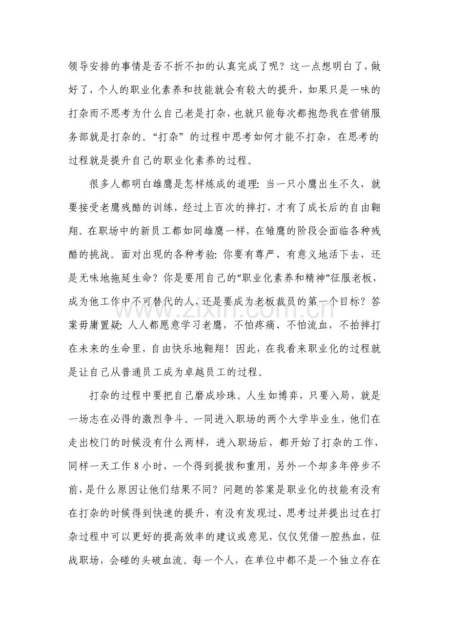 很多人都明白雄鹰是怎样炼成的道理:当一只小鹰出生不久,就要接受老鹰残酷的训练,经过上百次的摔打,才有了成长后的自由翱翔。在职场中的新员工都如同雄鹰一样,在雏鹰的阶段会面临各种残酷的挑战。面对出现的各种考验:你要有尊严、有意义地活下去,还是无味地拖延生命?你是要用自己的“职业化素养和精神”征服老板,成为他工作中不可替代的人,还是要成为老板裁员的第一个目标?答案毋庸置疑:人人都愿意学习老鹰,不怕疼痛、不怕流血,不拍摔打在未来的生命里,自由快乐地翱翔!因此,在我看来职业化的过程就是让自己从普通员工成为卓越员工的过程。