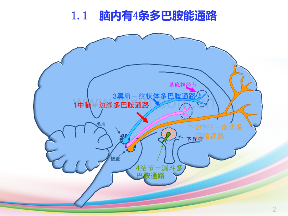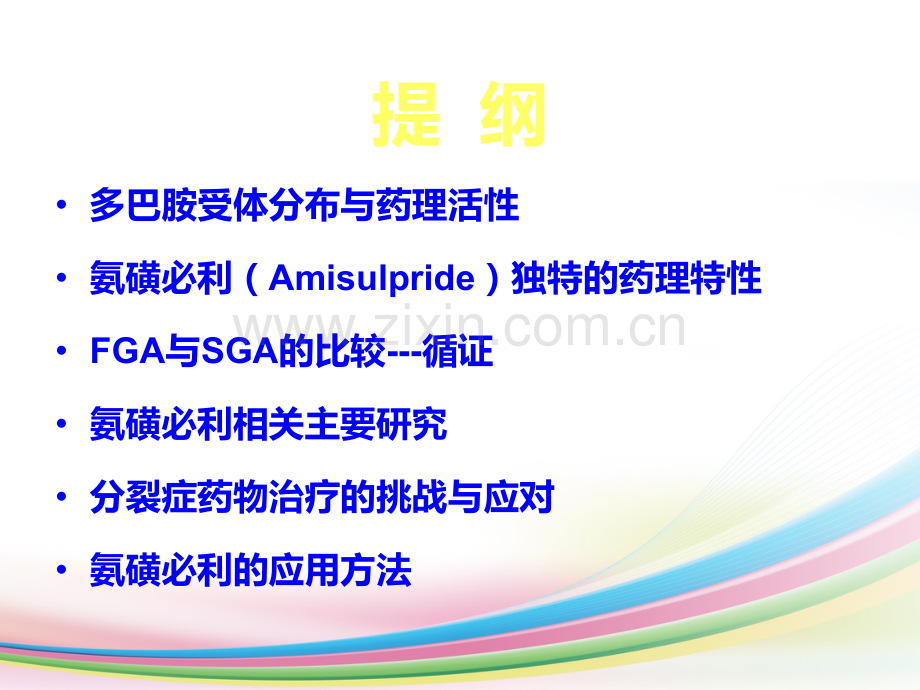 提纲多巴胺受体分布与药理活性氨磺必利(Amisulpride)独特的药理特性FGA与SGA的比较-循证氨磺必利相关主要研究分裂症药物治疗的挑战与应对氨磺必利的应用方法21.1 1.1 脑内有4 4条多巴胺能通路基底神经节被盖黑质下丘脑3黑质纹状体多巴胺通路1中脑边缘多巴胺通路2中脑皮质多巴胺通路4结节漏斗多巴胺通路1.2 1.2 精神症状与特定通路或脑区有关阳性症状:中脑边缘;中脑皮质阴性症状:中脑皮质/前额叶皮质;伏核/奖赏回路认知方面:背外侧前额叶皮质;情感症状:腹内侧前额叶皮质;攻击性:眶额叶皮质/杏仁核。药理学特征:药理学特征:D D1 1、D D5 5 D D1 1 族受体族受体 D D2 2、D D3 3、D D4 4 D D2 2族受体族受体中脑中脑-皮质:皮质:D D2 2族受体(族受体(D D2 2、D D3 3、D D4 4,与与SCHSCH有关)有关)中脑中脑-边缘通路:边缘通路:D D2 2族受体(族受体(D D2 2、D D3 3、D D4 4,与与SCHSCH有关)有关);黑质纹状体通路:黑质纹状体通路:D1D1族受体族受体,D2,D2、D3 D3(阻断可致(阻断可致EPSEPS)结节漏斗通路:结节漏斗通路:D D2 2受体受体1.3不同脑区多巴胺受体分布不同2024/3/16周六51.3.1 1.3.1 D1D1家族的位置(D1,D5)(D1,D5):分布最广泛,数目最多的DA突触后受体。主要分布于纹状体、大脑皮质,边缘系统等。前额叶(PFC)锥体神经元;前额叶含GABA的中间神经元上;皮质内锥体投射区;与D2不共戴天,大脑皮质中D1受体是D2的1020倍。D1家族比D2家族更直接地参与了认知活动。不阻断为好!Goldman-RakicPS,.D1receptorsinprefrontalcellsandcircuits.BrainResearchReviews:31,2000;295-NatesanS,etal.Theantipsychoticpotentialofl-tepholidine-anaturallyoccurringdopaminereceptorD1agonistandD2antagonist.Psychopharmacology2008:199:275-289.2024/3/16周六61.3.2D2家族的位置(D2,3,4)D2受体在皮受体在皮质质(前(前额额叶皮叶皮层层除外)、基底除外)、基底节节、边缘边缘系系统统分布广泛;分布广泛;D3和和D4受受体体亚亚型型主主要要在在边边缘缘系系统统,D3在在边边缘缘系系统统具具有有特特异异性性。在在D2较较多多的的纹纹状状体体中中几几乎乎不不存存在在D3。这这一一特特点点使使人人们们从从理理论论上上构构想想特特异异性性的的D3受受体体配配体体将有可能既抗精神分裂症的阳性症状,而又不将有可能既抗精神分裂症的阳性症状,而又不产产生生锥锥外系副作用。外系副作用。ASP对对边边缘缘系系统统D3/D4受受体体的的结结合合明明显显高高于于对对纹纹状状体体(ED50在在两两者者的的数数值值分分别别为为17.3,43.6mg/kg,比比值值为为1:2.6)。这这一一现现象象是是ASP引引起起EPS较较少少的的原原因因。【ED50是在量反是在量反应应中能引起中能引起50最大反最大反应应强强度的度的药药量量】PET研研究究显显示示,为为了了获获得得临临床床反反应应,至至少少需需要要占占据据 60%的的纹纹状状体体D2受受体体,超超过过80%的占据可引起的占据可引起EPS。2024/3/16周六71.4D3受体药理活性D3受体与D2受体有相似的药理活性,是抗精神病药物的重要的靶点。氨基酸排列有52%的相似性,膜穿透能力有75%的相似性。不同:在D2较多的纹状体中几乎不存在D3。D3受体阻断具有抗精神病作用的原因D3受体选择性分布于边缘叶;有些SCH病人的D3受体基因变异的频率明显高于对照人群,并且这些变异与病人对药物治疗的反应密切相关;D3受体是DA神经末梢的突触前受体,阻断此受体可促进DA的释放。目前已有用于治疗SCHD3受体拮抗剂处于开发阶段,其中,氨磺必利已应用临床。8精神分裂症的多巴胺假说中脑额叶和中脑边缘多巴胺通路阴性症状阳性症状额叶皮质活动低下边缘系统活动过度2024/3/16周六91.5边缘系统的结构和功能边缘系统主要由围绕侧脑室周围的结构组成,包括扣带回、海马旁回、海马结构、隔区和梨状区。扩大的边缘系统还包括与上述部位在功能和结构上密切相关的皮层和皮层下结构,如眶额回后部、岛叶前部、颞极、杏仁核、隔核、下丘脑、丘脑前核及中脑背盖内侧等。边缘系统在功能上主要与情绪反应(恐惧、愤怒)、行为(摄食、性、攻击)反应、内脏功能调节及记忆功能有关。其对内脏活动的影响主要通过下丘脑来实现。2024/3/16周六10基底神经节-基底节/核埋藏在大脑半球基底部。基底节由纹状体、杏仁核及屏状核组成。纹状体包括尾状核和豆状核。豆状核内侧部分纤维较多,色发白,称苍白球。外侧部叫壳核。与锥体外系功能有关丘脑底核、黑质和红核,也可视为基底节的组成部分,它们为更靠下部的神经核团。基底节及其神经通路称为锥体外系统。2024/3/16周六111.51.5 D3 D3受体的特异性定位意义如果某药物对D3受体有特异性结合作用,就意味着对边缘系统有特异性影响。如果能够同时阻断D2和D3受体,则只需要较少剂量,即可达到抗精神病作用。减少了对D2的阻断及不影响纹状体,意味发生EPS更少些。D3受体的特异性定位导致了假说:对该受体亚型有优先亲和性的抗精神病药会显示较高的有效性/不良事件比。几乎所有经典抗精神病药的疗效都与D2受体有关。如果药物能选择性作用于边缘系统D3、D4受体。则能提高抗精神病药疗效、减少副反应。氯氮平就是针对D4受体的药物典范。121.RichelsonE.J ClinPsychiatry.1996;57Suppl11:4-11;2.SchoemakerH,ClaustreY,FageD,etal.J Pharmacol ExpTher.1997;280(1):83-97;3.SeegerTF,SeymourPA,SchmidtAW,etal.J Pharmacol Exp Ther.1995;275(1):101-113;4.LawlerCP,PrioleauC,LewisMM,etal.Neuropsychopharmacol