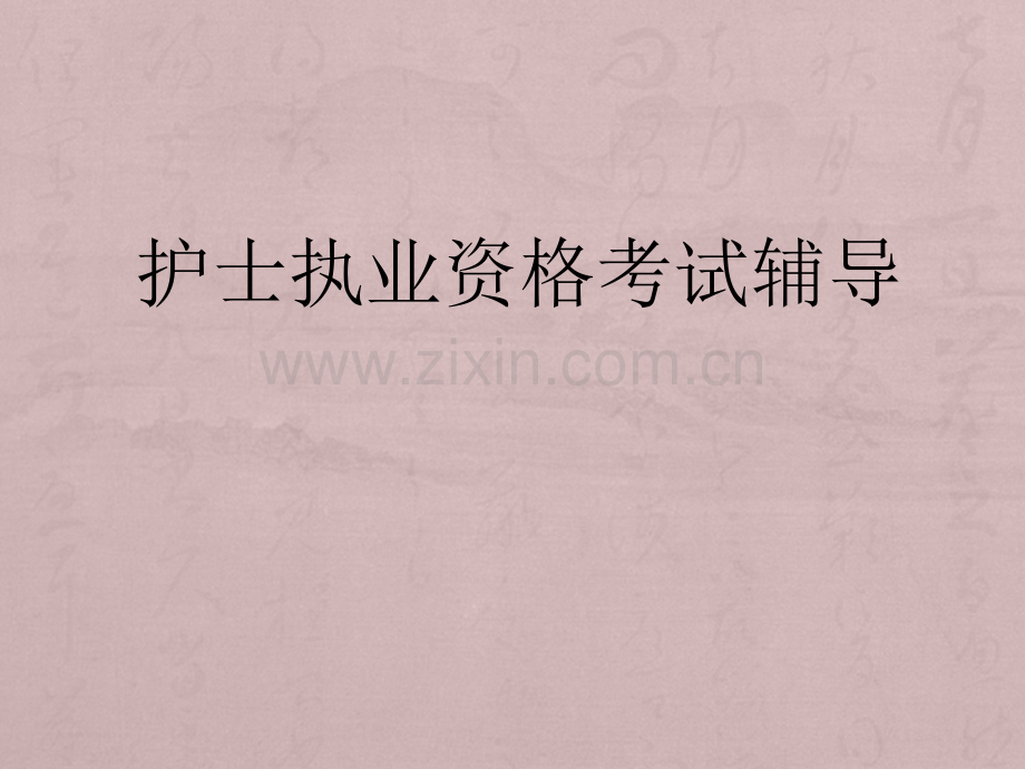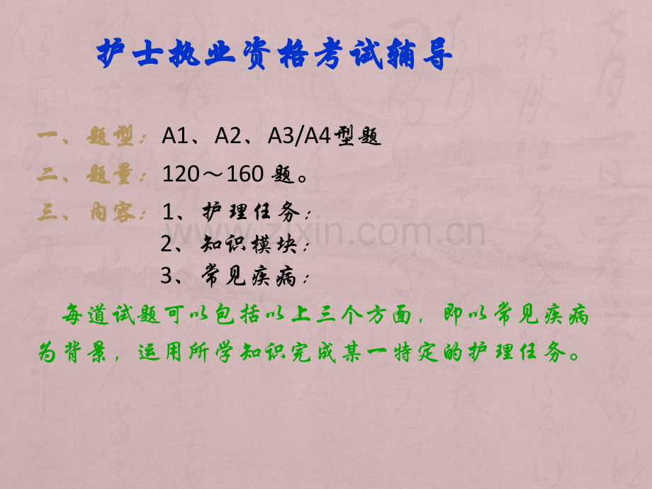 护士执业资格考试辅导 护士执业资格考试辅导护士执业资格考试辅导一、题型:一、题型:A1、A2、A3/A4型题二、题量:二、题量:120160 题。三、内容:三、内容:1、护理任务:2、知识模块:3、常见疾病:每道试题可以包括以上三个方面,即以常见疾病为背景,运用所学知识完成某一特定的护理任务。三、考核内容三、考核内容:包括三个方面。(一)护理任务:照护及满足患者基本需求;与协助治疗相关的任务;沟通及协调活动;评估/评价活动;保证患者安全;健康指导;伦理/法律活动。(二)知识模块:护理工作需要的医学基础知识;护理专业知识和技能;护理相关的社会人文知识。(三)常见疾病:循环、消化、呼吸、泌尿生殖系统疾病,传染性疾病,皮肤疾病,妊娠、分娩和产褥期疾病,新生儿疾病,损伤和中毒,肌肉骨骼系统和结缔组织疾病,肿瘤,血液、造血器官及免疫疾病,内分泌、营养及代谢疾病,神经系统疾病和精神障碍。每道试题可以包括以上三个方面,即以常见疾病为背景,运用所学知识完成某一特定的护理任务。+患者,男,78 岁,患原发性高血压 26 年,并发心力衰竭入 院。医嘱口服地高辛。护士给患者应用地高辛前,首先应评估的内容是:A。心率、心律 B、24 小时尿量C、呼吸频率 D、血压 E、水肿程度本题考查针对高血压合并心力衰竭患者(疾病背景),护士应在执行用药前运用所学的护理学知识(药理学知识)对患者进行评估(任务)。休克病人的血压正常、中心静脉压低,提示:A、血容量严重不足 B。血容量不足 C、心功能不全 D、肾功能衰竭 E、容量血管过度收缩四、科目划分:四、科目划分:(一)专业实务:运用与护理工作相关的知识,有效而安全地完成护理工作的能力。内容涉及与健康和疾病相关的医学知识、基础护理和技能,以及与护理相关的社会人文知识的临床运用能力等。(二)实践能力:运用护理专业知识和技能完成护理任务的能力。内容涉及疾病的临床表现、治疗原则、健康评估、护理程序及护理专业技术、健康教育等知识的临床运用等。(一)专业实务:1、女性21岁,现支气管哮喘急性发作,应采取A。端坐卧位 B、侧卧位 C、V型卧位D、去枕仰卧位 E、屈膝仰卧位 2、原发性肝癌最常见的发病人群为A、男性、2030岁 B、男性、3040岁 C、女性、3040岁 D。男性、4050岁 E、女性、4050岁3、与慢性胃炎和消化性溃疡有密切关系的病原菌为A、空肠弯曲菌;B。幽门螺杆菌;C、胎儿弯曲菌;D、鼠伤寒沙门菌;E、副溶血性弧菌;+女性,45岁,患支气管扩张10年,咳嗽,吐脓性痰,痰量50ml/天,下列处理不当的是A、体位引流 B、加强营养 C、给祛痰药 D、给雾化吸入 E。长期应用抗生素属于主观资料的是A、呼吸困难 B、黄疸 C、发绀 D。乏力 E、心脏杂音为防止脐带脱垂,采用的卧位是A、半坐卧位 B、V型体位 C、屈膝仰卧位 D、头高足低位 E。头低足高位(二)实践能力:女性、输血过程中出现畏寒、寒战,体温40,伴头痛、恶心、呕吐,首先考虑:A。发热反应 B、溶血反应 C、循环负荷过重 D、细菌污染反应 E、急性肺水肿 患者车祸后2小时来院,诉咳嗽,胸部疼痛。查T36.8,P130次/分,R30次/分,BP90/60mmHg,神清,右胸部压痛明显,右肺呼吸音低,右下肢骨折征。胸片示:右侧液气胸。首先采取的措施是:A、止痛 B、骨折固定 C、镇静 D。胸腔闭式引流 E、剖胸探查+急腹症患者哪项须作胃肠减压A。急性肠梗阻 B、老年急腹症患者 C、急腹症伴糖尿病 D、急腹症伴腹膜刺激征E、急腹症伴移动性浊音+患者男性,40岁。破伤风住院,全身肌肉紧张性收缩,阵发性痉挛,治疗的中心环节是A、清除毒素来源,彻底清楚坏死组织和异物B、用青霉素 C。用镇静解痉药D、中和游离毒素 E、防止并发症+患儿男,16岁,篮球比赛时不慎扭伤踝关节,40分钟后到校医室就诊,正确的处理方式是A、热敷 B。冷敷 C、热水足浴D、局部按摩 E、冷热交替使用五、题型说明:五、题型说明:全部采用选择题。由一个题干和五个选项组成,五个选项中只有一个正确答案,其余均为干扰答案。干扰答案可以部分正确或完全不正确。(一)A1型题(单句型最佳选择题)以简明扼要的提出问题为特点,1、导致粘连性肠梗阻最常见的原因是A、腹腔内炎症;B、腹腔内出血;C、腹腔内异物;D、腹腔内创伤;E。腹腔内手术。2、疲劳性骨折的好发部位是:A、髌骨上极 B、尺骨鹰嘴 C、第一趾骨 D。第二、三跖骨 E、尺骨下段 3、破伤风患者注射大量破伤风抗素目的是:A、控制和解除痉挛 B、抑制细菌生长 C、减少毒素的产生 D。中和游离毒素 E、中和游离与结合的毒素4、与妊娠高血压综合征无关的是A、双胎妊娠 B、胎盘早剥C。前置胎盘 D、羊水过多 E、胎儿窘迫5、吞服强酸类腐蚀性药物的患者禁忌的护理操作是:A。洗胃 B、口腔护理 C、输液 D、导泻 E、灌肠 6、不属于临产后正常宫缩特点的是(B)A、节律性 B。规律性 C、对称性 D、缩复作用 E、极性7、孕产妇死亡的主要原因不包括:A、产后出血,B、异位妊娠,C、产褥感染 D。前置胎盘,E、妊娠合并心脏病、8、血液中各种成分的含量大多随贮存时间的延长而下降,下列哪一项例外?A红细胞活力 B。钾离子浓度 CpH值 D血小板的活性 E红细胞携氧能力9、急性肾盂肾炎的女性青年,出院指导错误的是:A、低盐饮食 B。盆浴 C、多饮水 D、避免劳累 E、保持大便通畅(二)A2型题(病历摘要型最佳选择题)以叙述一段简要病历为特点,1、患者,男,30 岁。3