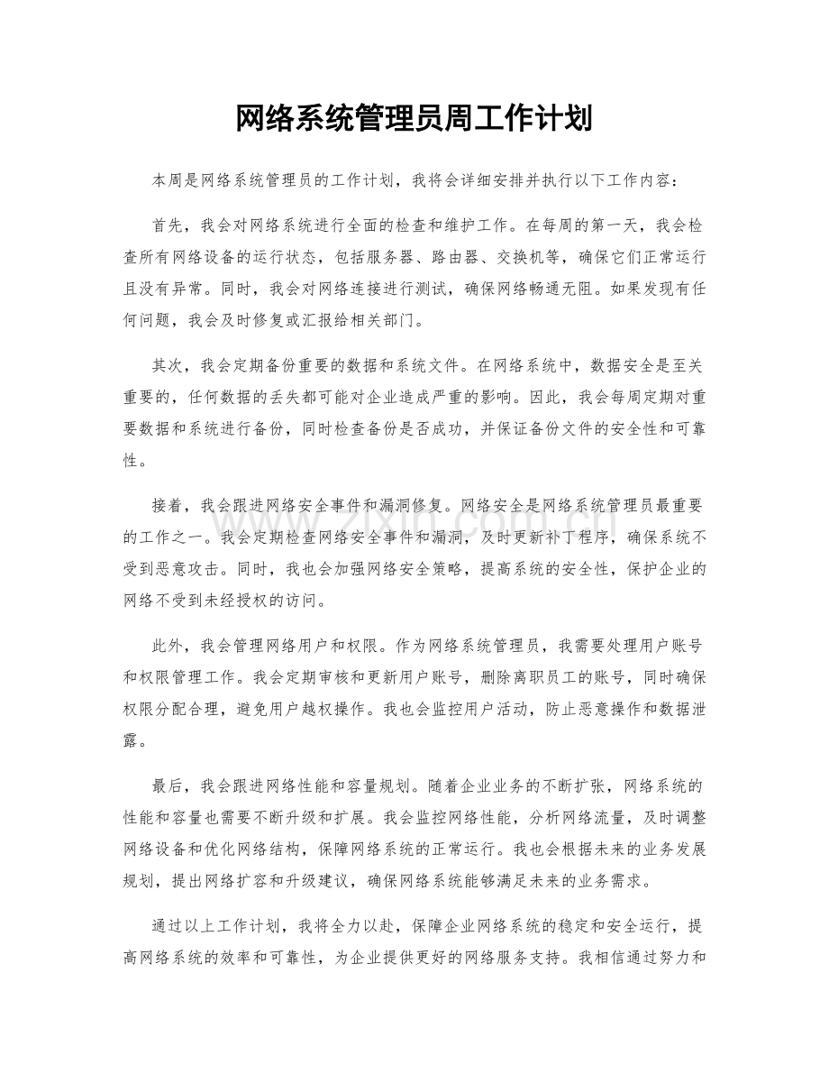 本周是网络系统管理员的工作计划,我将会详细安排并执行以下工作内容: