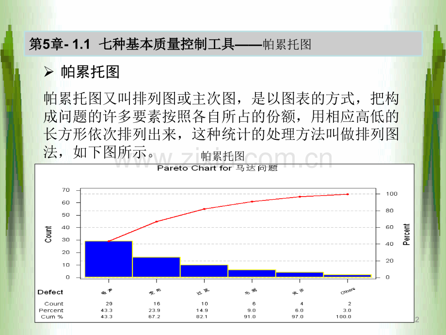 第第5章章-1.1 七种基本质量控制工具七种基本质量控制工具 1七种工具的概念七种工具的概念 在进行质量管理时,常用到的图形工具有七项,一般称为质量管理QC七大手法,包括,帕累托图 流程图,因果图,检查表,控制图,直方图,散布图。根据统计,这七种看似简单的工具就可以解决90以上的现场质量问题。第第5章章-1.1 七种基本质量控制工具七种基本质量控制工具帕累托图2帕累托图帕累托图又叫排列图或主次图,是以图表的方式,把构成问题的许多要素按照各自所占的份额,用相应高低的长方形依次排列出来,这种统计的处理方法叫做排列图法,如下图所示。帕累托图第第5章章-1.1 七种基本质量控制工具七种基本质量控制工具帕累托图3帕累托图的用途帕累托图的用途n确定改进主攻方向帕累托图的纵轴常常用来表示问题发生的百分比率,横轴表示造成问题的各个变量,绘制帕累托图时应当将造成问题发生的各个变量按照其造成问题发生的百分比率的大小,从左到右依次排列,然后再从左到右累积求各个变量造成问题发生的百分比之和,并描点连线,首先累计达到80的问题发生比率时,其各个变量就是所考察问题的关键因素和解决问题的方向。n确认改进效果在PDCA循环的C阶段,作出新的排列图,与未采取措施前的排列图进行比较,看看主要因素是否降到了次要地位,如果发生了这种变化,就证明改进的措施是有效的。n提出新的改进方向在新的排列图中,新上升为主要因素的项目应当在下个改进循环中得到解决。第第5章章-1.1 七种基本质量控制工具七种基本质量控制工具帕累托图4帕累托图的应用实例帕累托图的应用实例某个生产薄板生产车间的包装质量有问题,经过调查,找到造成问题的原因和它们的发生频数,统计整理后如下表,序号不合格原因频数(件)累计频数()1234567跺板不齐围板褶皱包装纸坏扎带松标签脱落垫版不合其它9482492515439417622525026526927234.5664.7182.7291.9197.4298.90100总计272第第5章章-1.1 七种基本质量控制工具七种基本质量控制工具帕累托图5帕累托图的应用实例帕累托图的应用实例下面使用MINITAB软件得到帕累托图的例子(路径为StatQuality ToolsPareto Chart)。第第5章章-1.1 七种基本质量控制工具七种基本质量控制工具帕累托图6帕累托图的分析方法帕累托图的习惯用法是按照累计百分数分成三类:A类,080(大致)为A类,属于A类的因素为主要因素和改进方向;B类,8090为B类,属于B类的因素为次要因素;C类,90100为C类,属于C类的因素为一般因素。A类的主要因素是解决质量问题的改进方向。第第5章章-1.1 七种基本质量控制工具七种基本质量控制工具流程图7流程图简介流程图简介流程图是理解和分析过程的主要方法之一,用于展现过程的步骤和决策点的顺序,下面是流程图的一个例子,装订?装订文件否是机器运转是否正常?开始接受文件输入复印份数开始复印重新开始纠正错误否整理结束是第第5章章-1.1 七种基本质量控制工具七种基本质量控制工具流程图8流程图的作用绘制流程图往往是质量改进团队确定问题的范围和讨论 解决方案的起始点。绘制流程图可以帮助质量改进团队成员对于过程和问题 所涉及的各个方面、各个环节有一个全面的共同的了解,达成共识。明确团队成员各自的角色,加强沟通与相互理解,以便更好地配合。通过讨论和绘制流程图,可以相互启发,发现和改进 过程中的冗余和缺陷。第第5章章-1.1 七种基本质量控制工具七种基本质量控制工具流程图9常见的常见的流程图种类流程图种类l高层过程流程图(SIPOC图)SIPOC(供应商、输入、过程、输出、顾客)分析被称为“高层过程流程图分析”。l制造业常用的流程图 制造业常用的流程图数量繁多,现列举如下,标识和可追溯性控制流程图 标书评审控制流程图 不合格品控制流程图 采购控制流程图l流程图使用注意事项流程图的绘制、变更、审批必须遵循严格的程序,必须在所涉及的所有部门得到充分沟通和确认。第第5章章-1.1 七种基本质量控制工具七种基本质量控制工具因果图10什么是因果图什么是因果图 因果图也称为石川图或鱼骨图,用来向质量改进成员分析产生质量问题的种种可能原因,从而找到问题的原因和结果之间关系的一种图形化工具。n 通过因果图的分析,要找出“为什么会造成这样的问题?”n 该方法常常结合头脑风暴法(Brainstorm)使用。第第5章章-1.1 七种基本质量控制工具七种基本质量控制工具因果图11因果图的形式因果图的形式质量问题结果主干大原因中原因小原因中枝小枝大枝第第5章章-1.1 七种基本质量控制工具七种基本质量控制工具因果图12因果图使用注意事项 因果图中原因的寻找主要从5M1E和4P方面来寻找。绘制因果图的过程就是结合头脑风暴法集思广益、广开言路、畅所欲言的过程,不要轻易批驳和反对别人的看法。对于可能的各个原因必要时使用更加复杂的统计工具(如,回归分析、假设检验、DOE等)分析,以便使得真正原因的寻找得到数据的支持。第第5章章-1.1 七种基本质量控制工具七种基本质量控制工具检查表13检查表简介检查表也叫记录表、调查表,用途是搜集与分析问题产生原因的原始数据信息的工具。第第5章章-1.1 七种基本质量控制工具七种基本质量控制工具检查表14制造业常用的检查表介绍制造业常用的检查表介绍工序质量分布调查表TUTL5101520254045505560