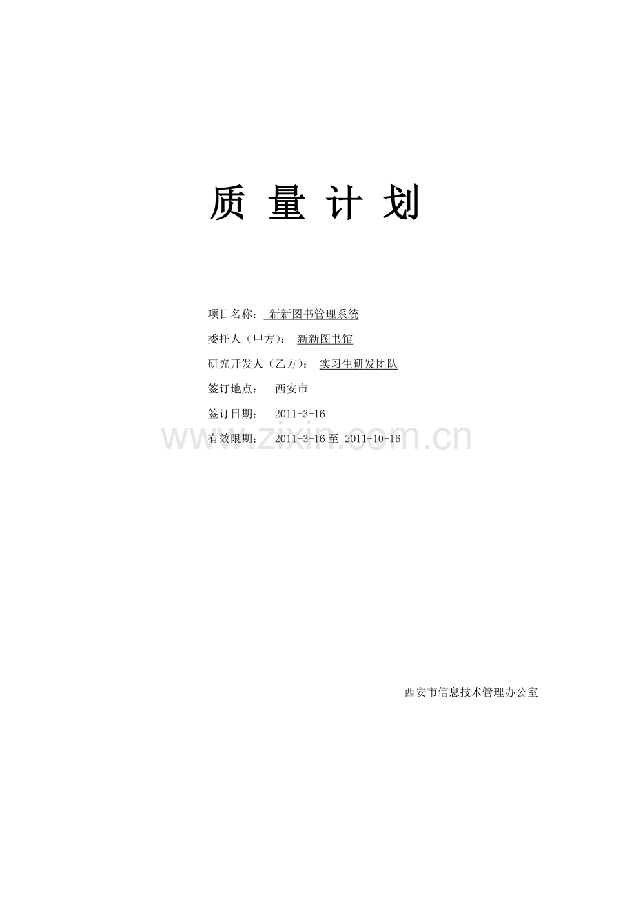 《新新图书馆里系统》质量计划说明在制定项目计划的时候,质量经理参与整个项目计划的制定过程,同时根据项目的特点和企业的质量保证体系,负责制定质量计划。质量计划的只要内容包括: