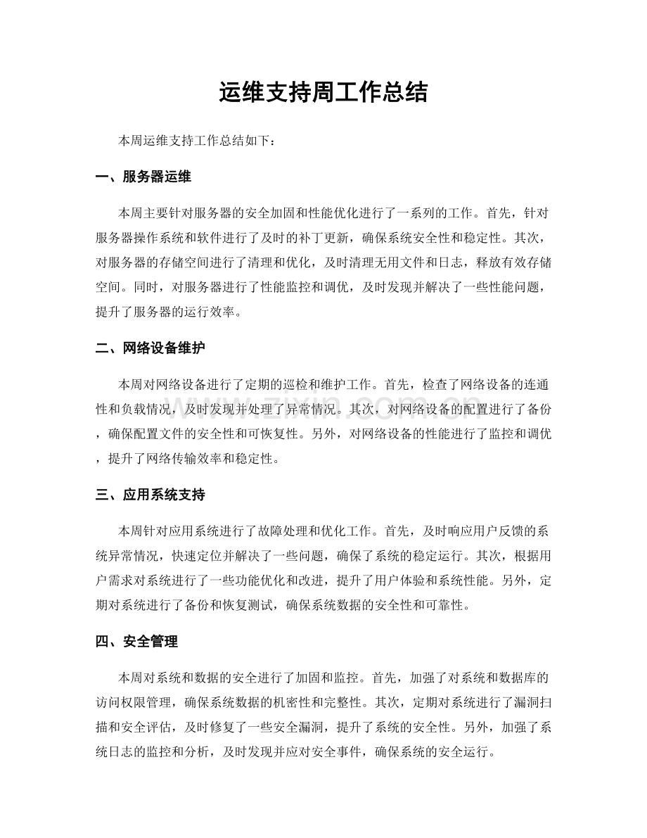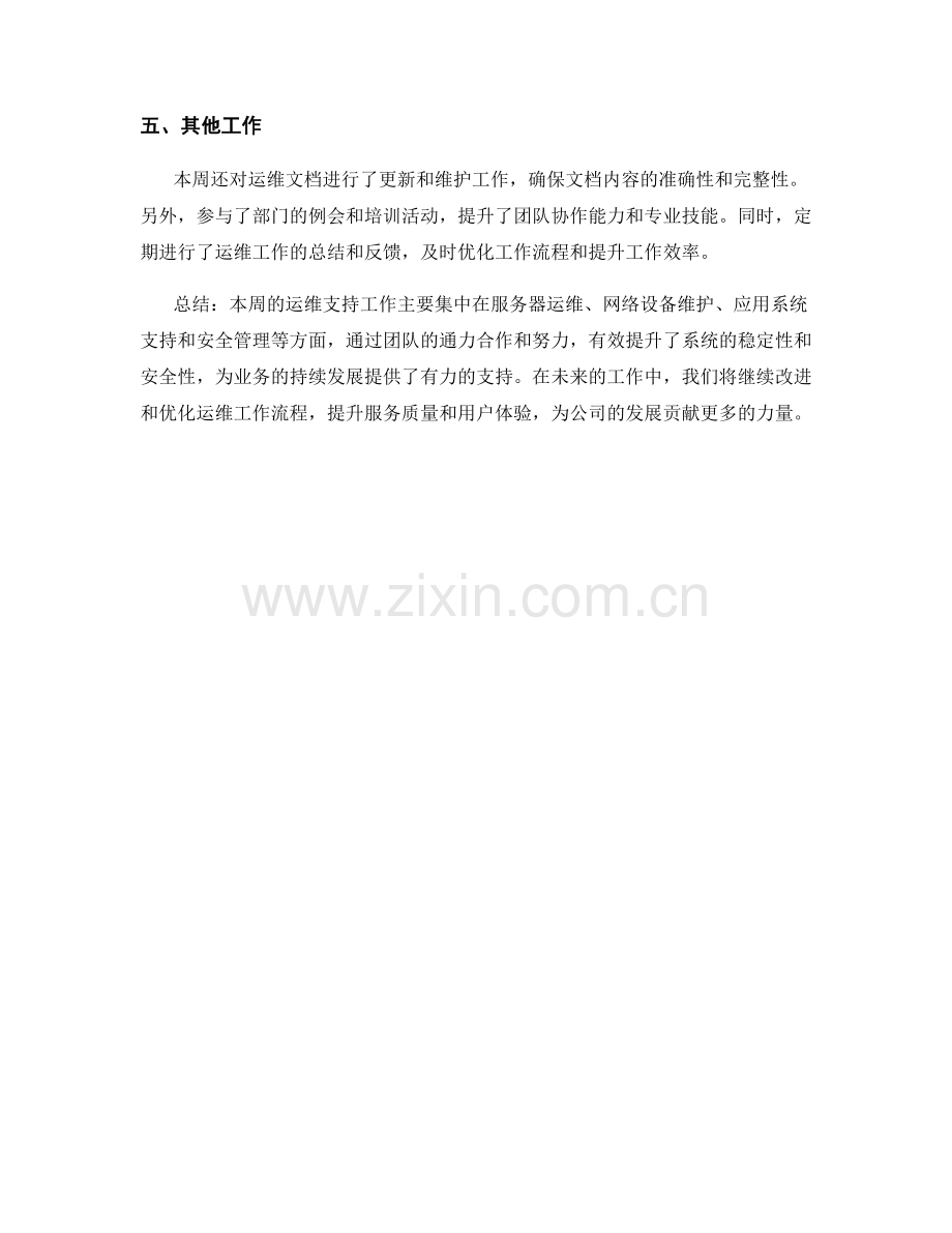 总结:本周的运维支持工作主要集中在服务器运维、网络设备维护、应用系统支持和安全管理等方面,通过团队的通力合作和努力,有效提升了系统的稳定性和安全性,为业务的持续发展提供了有力的支持。在未来的工作中,我们将继续改进和优化运维工作流程,提升服务质量和用户体验,为公司的发展贡献更多的力量。