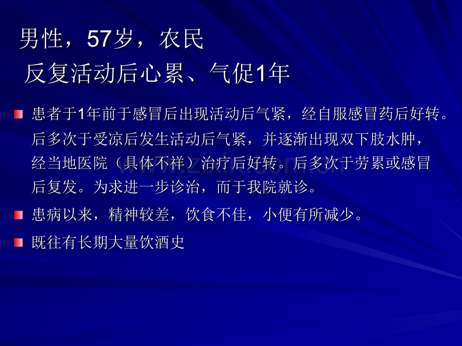 ARB在心力衰竭治疗中的应用男性,57岁,农民 反复活动后心累、气促1年患者于患者于1 1年前于感冒后出现活动后气紧,经自服感冒药后好转。年前于感冒后出现活动后气紧,经自服感冒药后好转。后多次于受凉后发生活动后气紧,并逐渐出现双下肢水肿,后多次于受凉后发生活动后气紧,并逐渐出现双下肢水肿,经当地医院(具体不祥)治疗后好转。后多次于劳累或感冒经当地医院(具体不祥)治疗后好转。后多次于劳累或感冒后复发后复发。为求进一步诊治,而于我院就诊。为求进一步诊治,而于我院就诊。患病以来,精神较差,饮食不佳,小便有所减少。患病以来,精神较差,饮食不佳,小便有所减少。既往有长期大量饮酒史既往有长期大量饮酒史T:36.3 P:85次/分,R:22次/分 BP:120/78 mmHg 氧饱和度:92%端坐位,呼吸急促。颈静脉充盈,肝颈征阳性。双肺中下份湿鸣明显,较对称,未闻及干鸣音。心界叩诊不清,心界叩诊不清,似有明显长大,心率120次/分,余心脏听诊不理想心脏听诊不理想。腹软,肝界长大,肋下2cm肝下5cm。双下肢水肿常规及生化检查基本正常冠脉造影基本正常治疗所选择的药物地高辛地高辛BB BB(美托洛尔)(美托洛尔)ACEI ACEI(蒙诺)(蒙诺)ARB ARB(代文)(代文)氢氯噻嗪氢氯噻嗪安体舒通安体舒通长效硝酸盐制剂长效硝酸盐制剂肼苯哒嗪肼苯哒嗪曲美他嗪(万爽力)曲美他嗪(万爽力)辅酶辅酶Q10Q10速尿速尿硝酸甘油硝酸甘油硝普钠硝普钠多巴胺多巴胺多巴酚丁胺多巴酚丁胺氨力农氨力农米力农米力农治疗最基本的药物氢氯噻嗪ACEI or ARBBB 美托洛尔安体舒通地高辛I 类答案似乎很简单,在不能耐受ACEI后可以选择ARB但临床永远不会那么简单从未使用过从未使用过ARBARB和和ACEIACEI的心衰患者,是否必须经过的心衰患者,是否必须经过ACEIACEI,不,不能耐受才换为能耐受才换为ARBARB?已经在使用已经在使用ARBARB的心衰患者,是否应该换为的心衰患者,是否应该换为ACEIACEI?已经使用已经使用ACEIACEI的心衰患者,是否可以加用的心衰患者,是否可以加用ARBARB?是否所有的心力衰竭都适合使用是否所有的心力衰竭都适合使用ARBARB?从未使用过ARB和ACEI的心衰患者,是否必须经过ACEI,不能耐受才换为ARB?ACEI vs ARBVALIANT 研究设计N=14703,急性心肌梗死(0.5-10天),合并心力衰竭的临床/放射影像学证据和/或左室收缩功能障碍主要终点:全因死亡率次要终点:心血管死亡、心力衰竭住院、心肌梗塞复发平均随访时间:24.7月事件驱动卡托普利50mg tid(n=4909)缬沙坦 160mg Bid(n=4909)卡托普利50mg tid+缬沙坦 80mg Bid(n=4885)随机、双盲、活性药对照死亡率和联合终点比较至少缬沙坦不比卡托普利差OPTIMAAL:Optimal Trial In Myocardial Infarction OPTIMAAL:Optimal Trial In Myocardial Infarction with the Angiotensin Antagonist Losartanwith the Angiotensin Antagonist Losartan DesignDesignMulticenter,multinational,randomized,double-blind,parallel-groupMulticenter,multinational,randomized,double-blind,parallel-groupPatientsPatients5466 patients aged 5466 patients aged 50 years with acute MI and evidence of heart failure 50 years with acute MI and evidence of heart failure or left ventricular dysfunction(left ventricular ejection fraction 35%)or left ventricular dysfunction(left ventricular ejection fraction 35%)Follow up and primary endpointFollow up and primary endpointPrimary endpoint:all-cause mortality.Mean 2.7 years follow upPrimary endpoint:all-cause mortality.Mean 2.7 years follow upTreatmentTreatmentCaptopril(titrated to target dose 50 mg three times daily,as tolerated)or Captopril(titrated to target dose 50 mg three times daily,as tolerated)or losartan(titrated to target 50 mg daily,as tolerated)losartan(titrated to target 50 mg daily,as tolerated)OPTIMAAL:Optimal Trial In Myocardial Infarction OPTIMAAL:Optimal Trial In Myocardial Infarction with the Angiotensin Antagonist Losartanwith the Angiotensin Antagonist Losartan-RESULTS continued-RESULTS continued-Months after randomizationMortality(%)0061218243036510152025All-cause mortalityDickstein et al.Lancet 2002;360:75260.P=0.069RR 1.13(95%CI 0.991.28)CaptoprilLosartanOPTIMAAL:Optimal Trial In Myocardial Infarction OPTIMAAL:Optimal Trial In Myocardial Infarction with the Angiotensin Antagonist Losartanwith the Angiotensin Antagonist Losartan-RESULTS continued-RESULTS continued-Months after randomizationEndpointrate(%)0061218243036Secondary and tertiary endpointsDickstein et al.Lancet 2002;360:75260.RR 1.19(95%CI 0.981.43)P=0.072CaptoprilLosartan05101551015Sudden cardiac death or cardiac arrestRR 1.03(95%CI 0.891.18)P=0.72ReinfarctionOPTIMAAL:Optimal Trial In Myocardial Infarction OPTIMAAL:Optimal Trial In Myocardial Infarction with the Angiotensin Antagonist Losartanwith the Angiotensin Antagonist Losartan-RESULTS continued-RESULTS continued-Months after randomizationHospitalization(%)006121824303620406080All-cause hospitalizationRR 1.03(95%CI 0.971.10)P=0.36CaptoprilLosartanDickstein et al.Lancet 2002;360:75260.OPTIMAAL:Optimal Trial In Myocardial Infarction OPTIMAAL:Optimal Trial In Myocardial Infarction with the Angiotensin Antagonist Losartanwith the Angiotensin Antagonist Losartan-SUMMARY-SUMMARY-In patients with acute MI and evidence of heart failure or left In patients with acute MI and evidence of heart failure or left ventricular dysfunction,losartan 50 mg daily:ventricular dysfunction,losartan 50 mg daily:Conferred no benefit in comparison with captoprilConferred no benefit in comparison with captopril Was better tolerated than captoprilWas better tolerated than captoprilACE inhibitors therefore remain the first-choice therapy in this groupACE inhibitors therefore remain the first-choice therapy in this groupRESOLVED结论:坎地沙坦和卡托