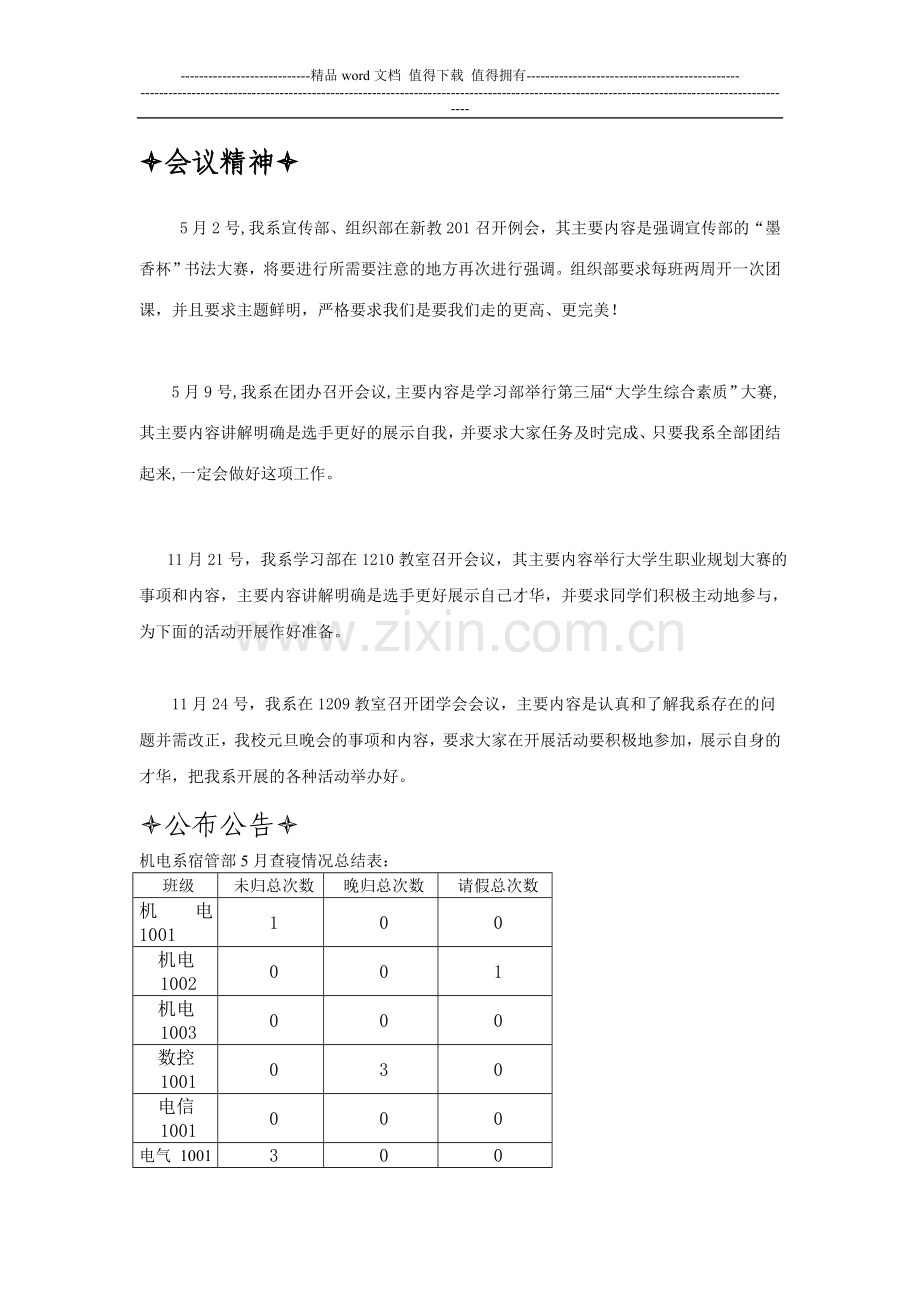 2.组织大一文艺委员召开会议。宣传各班同学积极参加即将到来的文艺节目,丰富同学们的业余生活,活跃校内气氛。