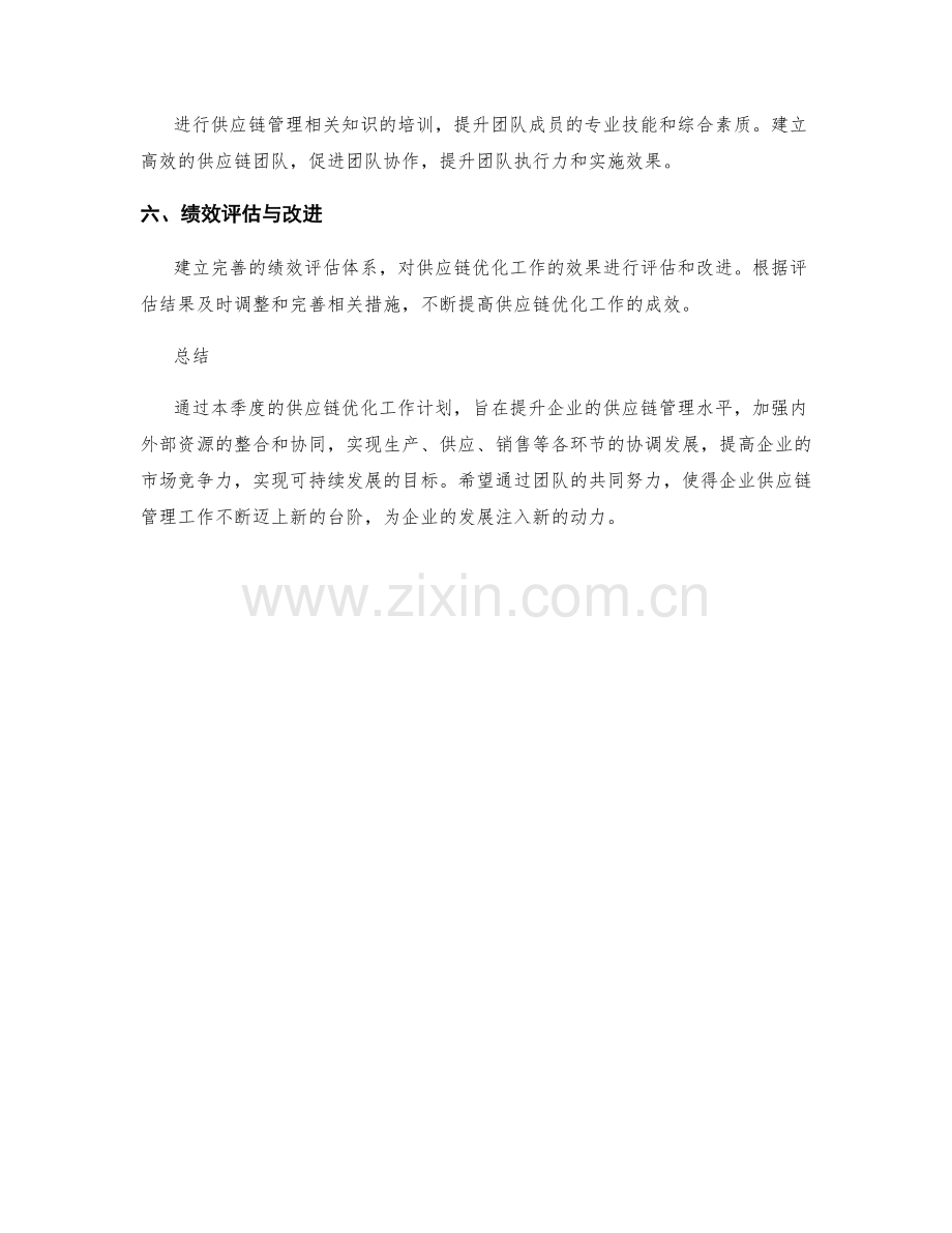 通过本季度的供应链优化工作计划,旨在提升企业的供应链管理水平,加强内外部资源的整合和协同,实现生产、供应、销售等各环节的协调发展,提高企业的市场竞争力,实现可持续发展的目标。希望通过团队的共同努力,使得企业供应链管理工作不断迈上新的台阶,为企业的发展注入新的动力。