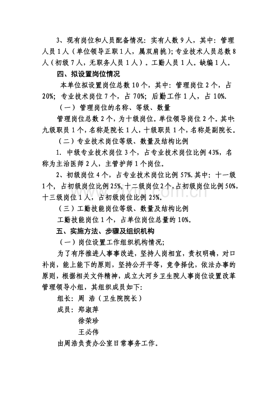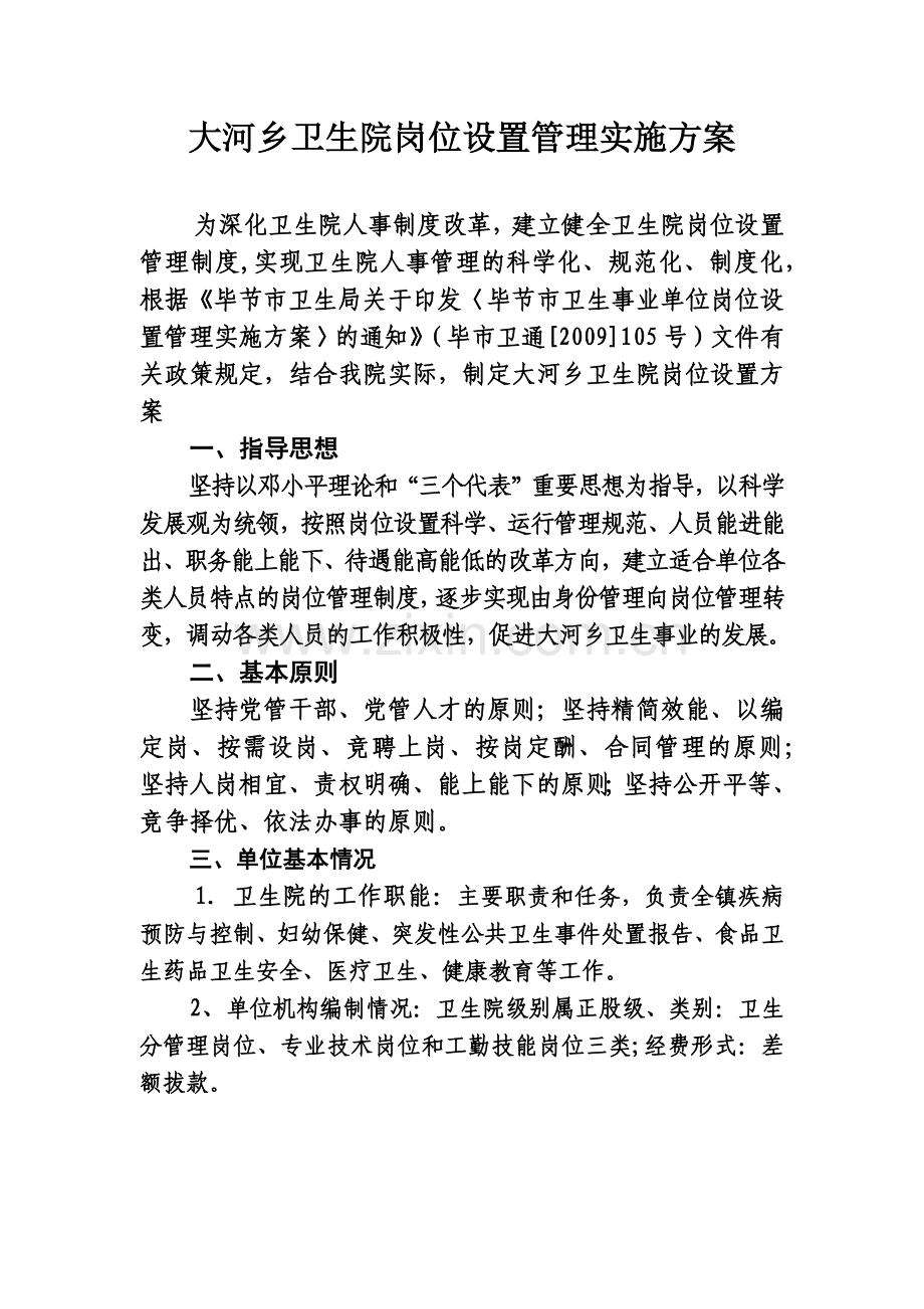 为深化卫生院人事制度改革,建立健全卫生院岗位设置管理制度,实现卫生院人事管理的科学化、规范化、制度化,根据《毕节市卫生局关于印发〈毕节市卫生事业单位岗位设置管理实施方案〉的通知》(毕市卫通[2009]105号)文件有关政策规定,结合我院实际,制定大河乡卫生院岗位设置方案