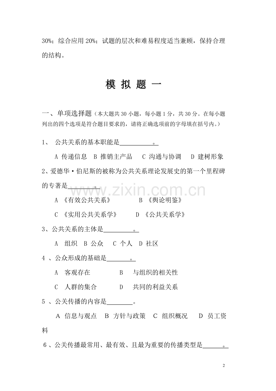 3 简单应用:指能够应用所学的知识分析、解决一些基本的公共关系问题。