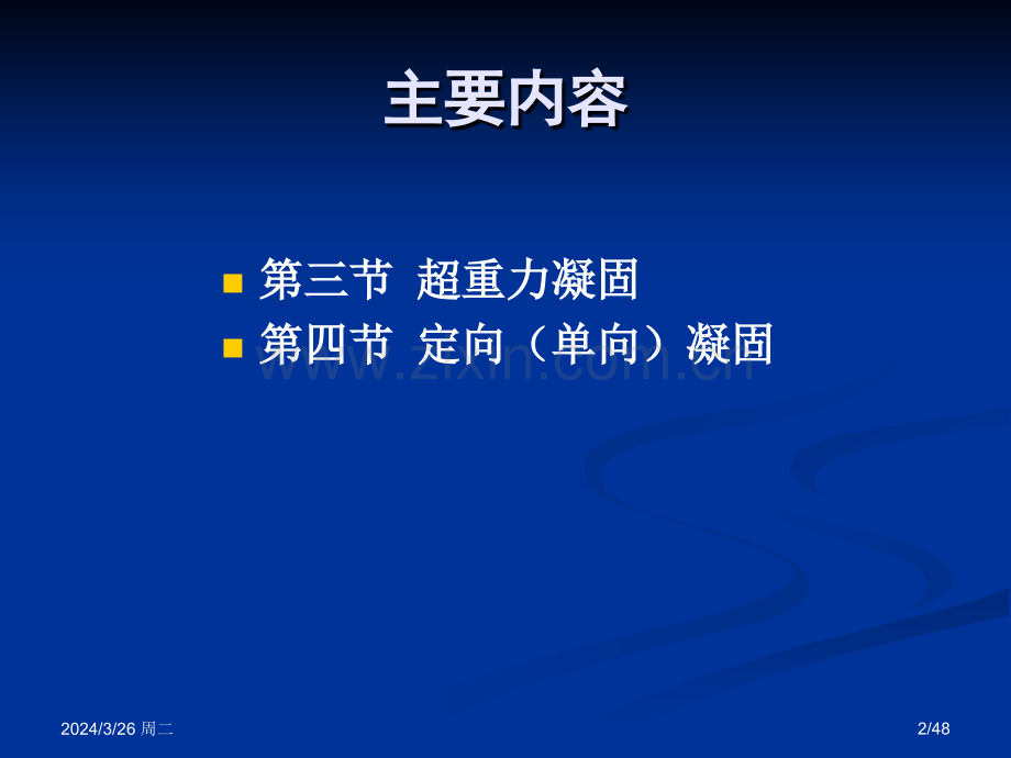 2024/3/26 周二1/48第九章第九章 液态金属在特殊液态金属在特殊条件下的凝固及成形条件下的凝固及成形(2 2)2024/3/26 周二2/48主要内容主要内容n第三节第三节 超重力凝固超重力凝固 n第四节第四节 定向(单向)定向(单向)凝固凝固2024/3/26 周二3/48第三节第三节 超重力凝固超重力凝固 n n只要物体的加速度与重力加速度的比值超只要物体的加速度与重力加速度的比值超过过 1,就可以认为该物体处于,就可以认为该物体处于超重力超重力状态。状态。n n达到超重力条件时,能改变固液界面前沿达到超重力条件时,能改变固液界面前沿的对流,并且可以获得组织均匀、性能良的对流,并且可以获得组织均匀、性能良好的晶体。好的晶体。2024/3/26 周二4/48一、超重力场的获得及产生原理一、超重力场的获得及产生原理 n n在实现超重力的手段中,应用最多的是在实现超重力的手段中,应用最多的是离离心机心机。n n该方法投资省、试验参数便于控制和测试。该方法投资省、试验参数便于控制和测试。2024/3/26 周二5/48n n理论分析表明,理论分析表明,理论分析表明,理论分析表明,“g g”越大,两相接触过程的动力越大,两相接触过程的动力越大,两相接触过程的动力越大,两相接触过程的动力因素即因素即因素即因素即浮力因子浮力因子浮力因子浮力因子 (g g)越大,)越大,)越大,)越大,流体相对滑动速流体相对滑动速流体相对滑动速流体相对滑动速度也越大度也越大度也越大度也越大。n n巨大的剪切应力克服了表面张力,可使液体伸展巨大的剪切应力克服了表面张力,可使液体伸展巨大的剪切应力克服了表面张力,可使液体伸展巨大的剪切应力克服了表面张力,可使液体伸展出巨大的相际接触界面,从而极大地出巨大的相际接触界面,从而极大地出巨大的相际接触界面,从而极大地出巨大的相际接触界面,从而极大地强化了传质强化了传质强化了传质强化了传质过程过程过程过程,这一结论导致了超重力的诞生。,这一结论导致了超重力的诞生。,这一结论导致了超重力的诞生。,这一结论导致了超重力的诞生。n n显然,由于显然,由于显然,由于显然,由于 (g g)的大幅度提高,不仅质量传)的大幅度提高,不仅质量传)的大幅度提高,不仅质量传)的大幅度提高,不仅质量传递,而且递,而且递,而且递,而且动量、热量传递以及与传递相关的过程动量、热量传递以及与传递相关的过程动量、热量传递以及与传递相关的过程动量、热量传递以及与传递相关的过程也都会得到强化也都会得到强化也都会得到强化也都会得到强化。n n超重力技术被认为是超重力技术被认为是超重力技术被认为是超重力技术被认为是强化传递强化传递强化传递强化传递的一项突破性技术。的一项突破性技术。的一项突破性技术。的一项突破性技术。2024/3/26 周二6/48二、超重力下熔体的结晶二、超重力下熔体的结晶 n n在超重力状态下,熔体中在超重力状态下,熔体中在超重力状态下,熔体中在超重力状态下,熔体中浮力对流强度得到加强浮力对流强度得到加强浮力对流强度得到加强浮力对流强度得到加强,液流状态随对流强度发生变化。液流状态随对流强度发生变化。液流状态随对流强度发生变化。液流状态随对流强度发生变化。n n反映在反映在反映在反映在温度的波动温度的波动温度的波动温度的波动上,层流温度起伏平缓,而上,层流温度起伏平缓,而上,层流温度起伏平缓,而上,层流温度起伏平缓,而紊紊紊紊流温度波动剧烈流温度波动剧烈流温度波动剧烈流温度波动剧烈。n n温度的波动会造成生长界面的热扰动,从而带来温度的波动会造成生长界面的热扰动,从而带来温度的波动会造成生长界面的热扰动,从而带来温度的波动会造成生长界面的热扰动,从而带来成分的波动成分的波动成分的波动成分的波动。n n随着重力水平的提高,熔体的流态随着重力水平的提高,熔体的流态随着重力水平的提高,熔体的流态随着重力水平的提高,熔体的流态由层流转化为由层流转化为由层流转化为由层流转化为紊流紊流紊流紊流,加速度达一定水平时,熔体又由紊流转化,加速度达一定水平时,熔体又由紊流转化,加速度达一定水平时,熔体又由紊流转化,加速度达一定水平时,熔体又由紊流转化为层流,即所谓为层流,即所谓为层流,即所谓为层流,即所谓重新层流化重新层流化重新层流化重新层流化。n n这是一种高速层流状态,极大地提高凝固界面的这是一种高速层流状态,极大地提高凝固界面的这是一种高速层流状态,极大地提高凝固界面的这是一种高速层流状态,极大地提高凝固界面的热稳定性,为制备无偏析晶体创造了条件。热稳定性,为制备无偏析晶体创造了条件。热稳定性,为制备无偏析晶体创造了条件。热稳定性,为制备无偏析晶体创造了条件。2024/3/26 周二7/48n n重力下的凝固会产生重力下的凝固会产生重力下的凝固会产生重力下的凝固会产生生长条纹缺陷生长条纹缺陷生长条纹缺陷生长条纹缺陷,这是一种微,这是一种微,这是一种微,这是一种微观不均匀性。观不均匀性。观不均匀性。观不均匀性。n n生长条纹是重力驱动的对流造成的。生长条纹是重力驱动的对流造成的。生长条纹是重力驱动的对流造成的。生长条纹是重力驱动的对流造成的。n n在在在在超重力超重力超重力超重力条件下,可条件下,可条件下