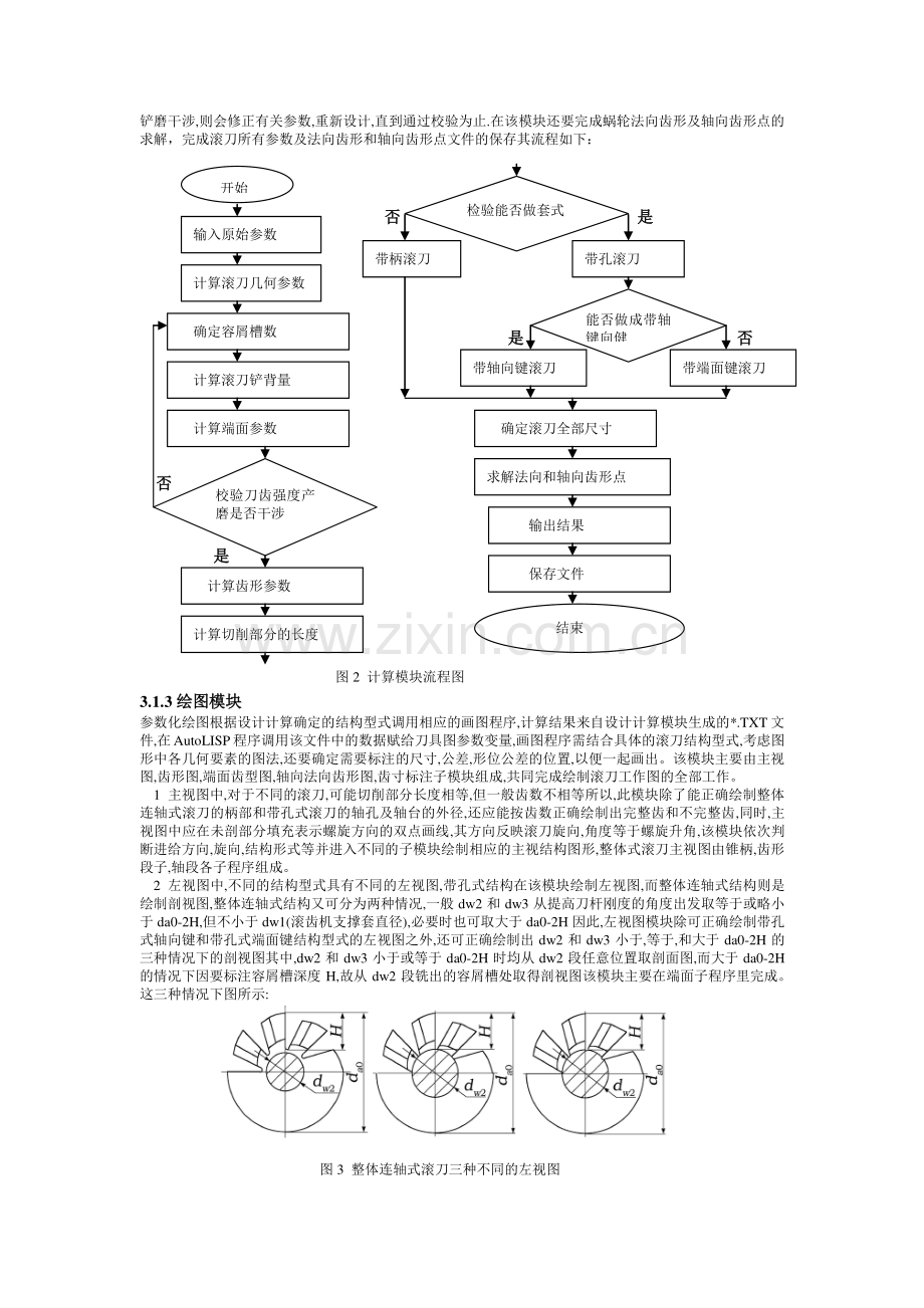 2左视图中,不同的结构型式具有不同的左视图,带孔式结构在该模块绘制左视图,而整体连轴式结构则是绘制剖视图,整体连轴式结构又可分为两种情况,一般dw2和dw3从提高刀杆刚度的角度出发取等于或略小于da0-2H,但不小于dw1(滚齿机支撑套直径),必要时也可取大于da0-2H因此,左视图模块除可正确绘制带孔式轴向键和带孔式端面键结构型式的左视图之外,还可正确绘制出dw2和dw3小于,等于,和大于da0-2H的三种情况下的剖视图其中,dw2和dw3小于或等于da0-2H时均从dw2段任意位置取剖面图,而大于da0-2H的情况下因要标注容屑槽深度H,故从dw2段铣出的容屑槽处取得剖视图该模块主要在端面子程序里完成。这三种情况下图所示:
