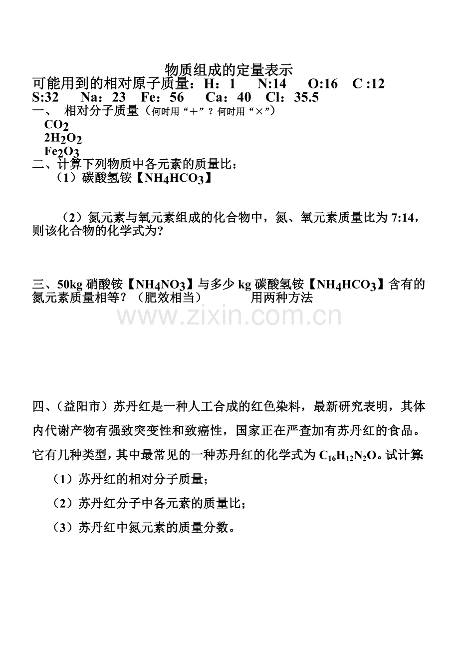 四、(益阳市)苏丹红是一种人工合成的红色染料,最新研究表明,其体内代谢产物有强致突变性和致癌性,国家正在严查加有苏丹红的食品。它有几种类型,其中最常见的一种苏丹红的化学式为C16H12N2O。试计算: