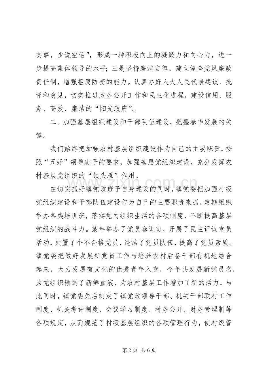 在切实抓好镇党政班子自身建设的同时,镇党委把加强村级党组织建设和干部队伍建设作为自己的主要职责来抓,定期组织举办各类培训班,落实党内组织生活的各项制度,不断提高基层党组织的战斗力。某年举办了党员春训班,开展了民主评议党员活动,处置了个不合格党员,纯洁了党员队伍,提高了党员素质。镇党委把做好发展新党员工作与培养农村后备干部有机地结合起来,大力发展有文化的优秀青年入党,今年共发展新党员名,为党组织输送了新鲜血液,为农村基层工作增加了新的活力。与此同时,镇党委先后制定了镇党政领导干部、机关干部联村工作制度、机关考评制度、会议学习制度、村务公开、财务管理制等各项规定,从而规范了村级基层组织的各项管理行为,使村级管理和干部管理逐步走上制度化、规范化的轨道,基层组织的凝聚力、战斗力明显增强,全镇上下一致,政令畅通,有一种奋发向上、争创一流的精神风貌,各项工作形成了你追我赶,不甘落后的氛围,确保了各项工作任务的完成。