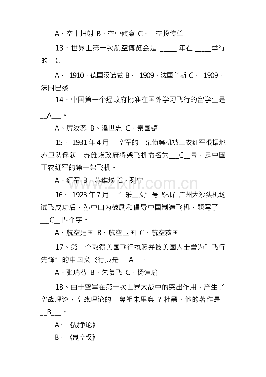 11、中国第一所正规的航空学校于___C__在北京南苑成 立。