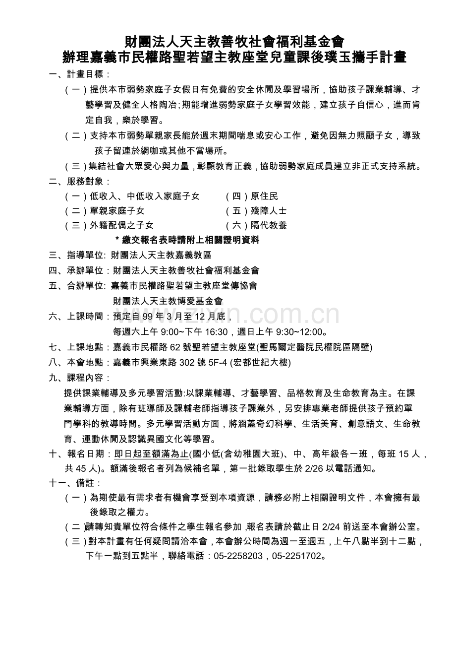 嘉義市民權路聖若望主教座堂兒童課後璞玉攜手計畫報名表