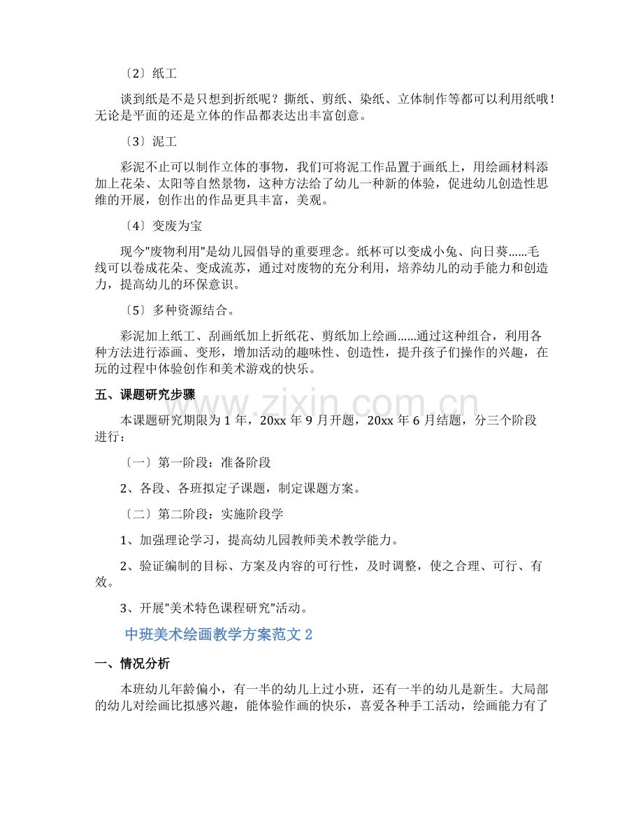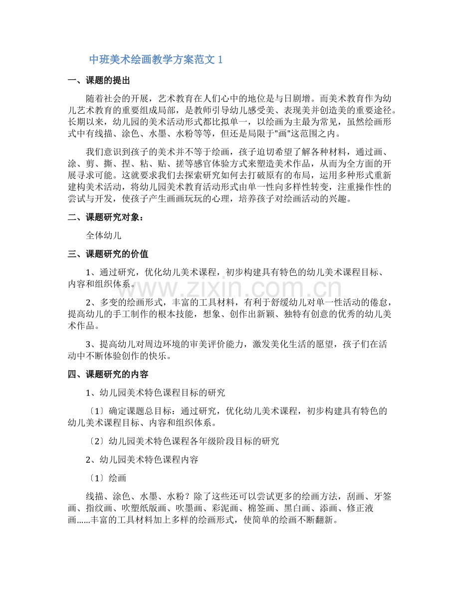中班美术绘画教学方案范文中班美术绘画教学方案范文 1 1一、课题的提出一、课题的提出随着社会的开展,艺术教育在人们心中的地位是与日剧增。而美术教育作为幼儿艺术教育的重要组成局部,是教师引导幼儿感受美、表现美并创造美的重要途径。长期以来,幼儿园的美术活动形式都比拟单一,以绘画为主最为常见,虽然绘画形式中有线描、涂色、水墨、水粉等等,但还是局限于画这范围之内。我们意识到孩子的美术并不等于绘画,孩子迫切希望了解各种材料,通过画、涂、剪、撕、捏、粘、贴、搓等感官体验方式来塑造美术作品,从而为全方面的开展寻求可能。这就要求我们去探索研究如何去打破原有的布局,运用多种形式重新建构美术活动,将幼儿园美术教育活动形式由单一性向多样性转变,注重操作性的尝试与开发,使孩子产生画画玩玩的心理,培养孩子对绘画活动的兴趣。二、课题研究对象:二、课题研究对象:全体幼儿三、课题研究的价值三、课题研究的价值1、通过研究,优化幼儿美术课程,初步构建具有特色的幼儿美术课程目标、内容和组织体系。2、多变的绘画形式,丰富的工具材料,有利于舒缓幼儿对单一性活动的倦怠,提高幼儿的手工制作的根本技能,想象、创作出新颖、独特有创意的优秀的幼儿美术作品。3、提高幼儿对周边环境的审美评价能力,激发美化生活的愿望,孩子们在活动中不断体验创作的快乐。四、课题研究的内容四、课题研究的内容1、幼儿园美术特色课程目标的研究1确定课题总目标:通过研究,优化幼儿美术课程,初步构建具有特色的幼儿美术课程目标、内容和组织体系。2幼儿园美术特色课程各年级阶段目标的研究2、幼儿园美术特色课程内容1绘画线描、涂色、水墨、水粉?除了这些还可以尝试更多的绘画方法,刮画、牙签画、指纹画、吹塑纸版画、吹墨画、彩泥画、棉签画、黑白画、添画、修正液画丰富的工具材料加上多样的绘画形式,使简单的绘画不断翻新。2纸工谈到纸是不是只想到折纸呢?撕纸、剪纸、染纸、立体制作等都可以利用纸哦!无论是平面的还是立体的作品都表达出丰富创意。3泥工彩泥不止可以制作立体的事物,我们可将泥工作品置于画纸上,用绘画材料添加上花朵、太阳等自然景物,这种方法给了幼儿一种新的体验,促进幼儿创造性思维的开展,创作出的作品更具丰富,美观。4变废为宝现今废物利用是幼儿园倡导的重要理念。纸杯可以变成小兔、向日葵毛线可以卷成花朵、变成流苏,通过对废物的充分利用,培养幼儿的动手能力和创造力,提高幼儿的环保意识。5多种资源结合。彩泥加上纸工、刮画纸加上折纸花、剪纸加上绘画通过这种组合,利用各种方法进行添画、变形,增加活动的趣味性、创造性,提升孩子们操作的兴趣,在玩的过程中体验创作和美术游戏的快乐。五、课题研究步骤五、课题研究步骤本课题研究期限为 1 年,20 xx 年 9 月开题,20 xx 年 6 月结题,分三个阶段进行:一第一阶段:准备阶段2、各段、各班拟定子课题,制定课题方案。二第二阶段:实施阶段学1、加强理论学习,提高幼儿园教师美术教学能力。2、验证编制的目标、方案及内容的可行性,及时调整,使之合理、可行、有效。3、开展美术特色课程研究活动。中班美术绘画教学方案范文中班美术绘画教学方案范文 2 2一、情况分析一、情况分析本班幼儿年龄偏小,有一半的幼儿上过小班,还有一半的幼儿是新生。大局部的幼儿对绘画比拟感兴趣,能体验作画的快乐,喜爱各种手工活动,绘画能力有了一定的提高。本学期将继续培养幼儿自由作画的能力,丰富他们的感性经验,激发他们表现美、创造美的情趣。二、活动目标二、活动目标1、引导幼儿接触周围环境和生活中美好的人、事、物,丰富他们的感性经验和审美情趣,激发他们表现美、创造美的情趣。2、通过多种形式的美术活动,使幼儿体验到美术活动的乐趣,提高幼儿对美术活动的兴趣。3、学习观察生活,了解生活,提高幼儿的观察力、记忆力、想象力和创作力,培养幼儿良好的个性品质。4、运用各种线条和块面大胆地表现在生活中感受过的物体的根本形象和主要特征,大胆地按自己的意愿画画。5、学习运用各种工具材料大胆地进行手工活动,对手工活动感兴趣,并能运用自己制作的玩具、手工作品来美化自己的生活或开展其他活动。6、通过欣赏名画家的代表作,欣赏民间工艺品,节日教室布置,欣赏和评价同伴的美术作品,提高对美的欣赏力。三、实施措施三、实施措施1、引导幼儿以自己的方式通过感知对象的审美特征,如造型、设色、构图、节奏、韵律、均衡等来感受其情感表现。2、创造宽松的心理环境,提供有表现力的物质媒介,激发幼儿的创造意识和动机。3、运用纵向评价的方法,用具体的评价鼓励幼儿积极创造。4、美术教育与其他各领域之间相互渗透。四、教学进度安排四、教学进度安排1、常规常规2、红、黄、蓝构成欣赏七巧板绘画3、爱跳舞的格子绘画彩虹窗花手工4、黑白装饰画绘画布老虎一欣赏5、放假放假6、布老虎二手工糖果的新衣欣赏7、百老汇爵士乐欣赏美丽的花边一欣赏8、美丽的花边二绘画妙妙线手工9、彩条的舞蹈手工爸爸的.领带绘画10、小蜗牛出来了手工纸袋玩偶手工11、阿福欣赏说唱陶俑欣赏12、笑得露出牙齿的脸绘画好朋友的脸手工13、哭泣的