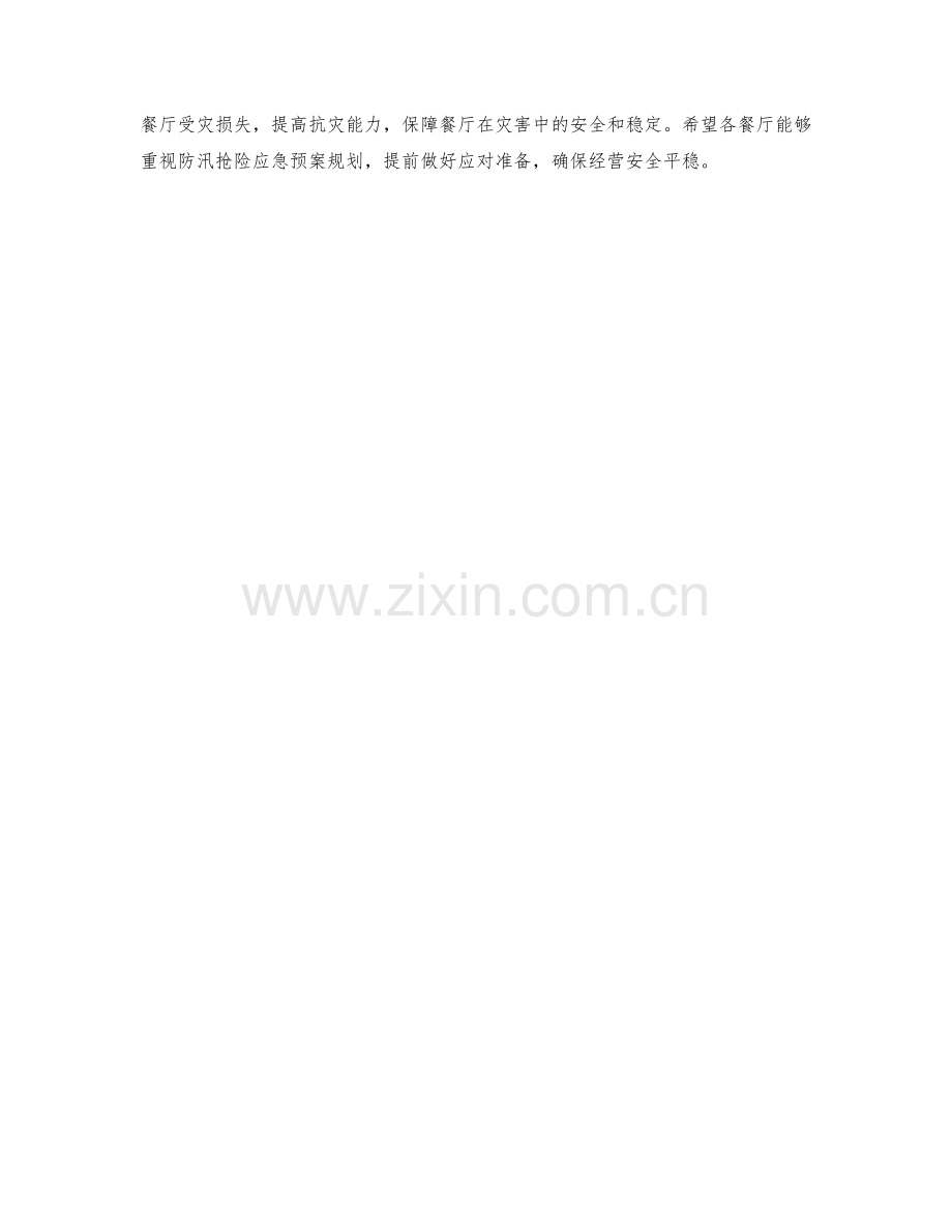 总之,餐厅防汛抢险应急预案规划是保障餐厅业务正常运营和员工安全的关键措施。通过建立健全的应急预案、培训员工、购置应急物资等措施,可以有效降低餐厅受灾损失,提高抗灾能力,保障餐厅在灾害中的安全和稳定。希望各餐厅能够重视防汛抢险应急预案规划,提前做好应对准备,确保经营安全平稳。
