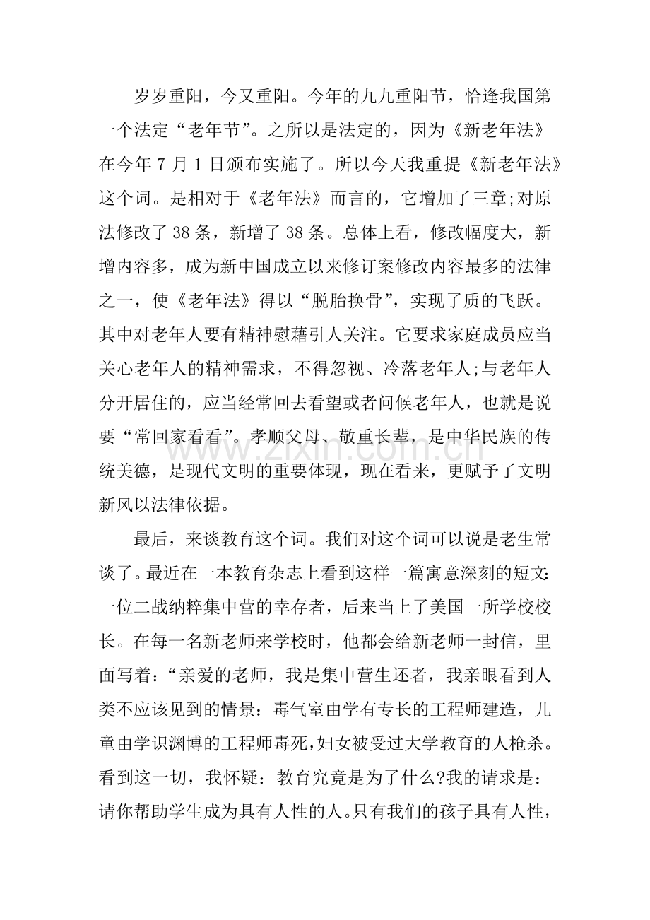 大家上午好!今天,我想借国旗下讲话的时间,和大家分享我对三个词汇的认识和思考:一个是重阳节、一个是《新老年法》、一个是教育。