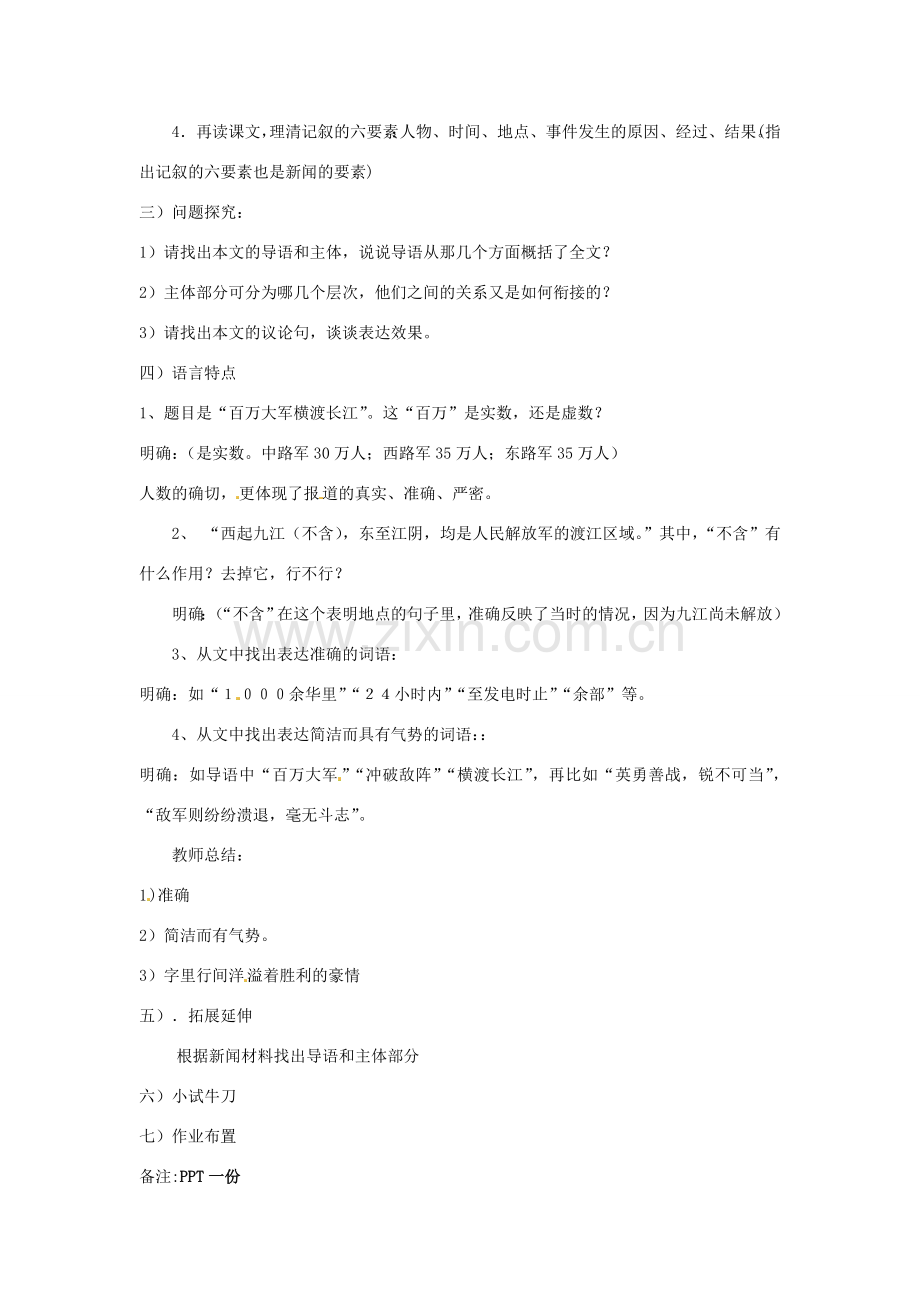 (教师朗诵毛主席所作的《人民解放军占领南京》一诗,声情并茂地导入课文)这首诗是为人民解放军解放南京而作,表现了人民解放军的英雄气概。历史告诉我们,中国革命的胜利是经过长期革命战争战胜强大敌人取得的,今天,我们学习的是毛泽东为人民解放军百万大军横渡长江亲自撰写的一篇新闻,题目是“人民解放军百万大军横渡长江”。