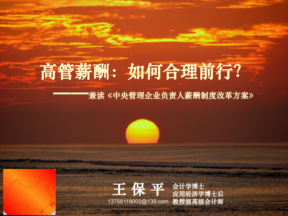 单击此处编辑母版标题样式,单击此处编辑母版文本样式,第二级,第三级,第四级,第五级,2020/2/19,高管薪酬:如何合理前行?,兼读中央管理企业负责人薪酬制度改革方案,王 保 平,13758119002,会计学博士,应用经济学博士后,教授级高级会计师,王保平简介,先后毕业于陕西财经学院、厦门大学、中央财经大学,分别获得本科、硕士、博士学位。,现为,中国财政学会理事、浙江省会计学会常务理事、浙江省会计学会副秘书长。兼任中央财经大学、北京国家会计学院、浙江工商大学、浙江财经大学、杭州电子科技大学等硕士研究生实务导师。,在会计研究、税务研究、保险研究、财务与会计等,发表,专业论文近百篇,出版国有资产监管的理论与实践、,1+38,的故事企业会计准则趣绎、资本监管博弈论、集团内部控制论、企业内部控制操作实务与案例分析、综合财务指数大数据时代的会计新能量、保险公司会计实务、商业银行会计实务等专著,10,部。,2025/2/17 周一,第一篇,国企高管,薪酬的政策视角,第三篇,国企高管,薪酬的,社会,视角,第二篇,国企高管,薪酬的,专业,视角,目,录,中央,政治局,2014,年,8,月,29,日审议通过,:,“,适应国资管理体制和国企改革进程,逐步规范企业收入分配秩序,实现薪酬水平适当、结构合理、管理规范、监督有效,对不合理的偏高、过高收入进行调整。,”,“国企特别是,中,管企业,在关系国家安全和国民经济命脉的主要行业和关键领域占据支配地位,是国民经济的重要支柱,在我们党和我国社会主义国家政权的经济基础中也是起支柱作用的,必须搞好。”,这是,国企高管,薪酬制度改革的理论基础,。,2025/2/17 周一,中央管理企业负责人薪酬制度改革方案,一,薪酬改革,“,合理,”,取向,二,薪酬改革,“,合理,”,目的,三,三,薪酬改革,“,合理,”,进程,四,薪,酬改革,“,合理,”,建议,五,薪酬改革,“,党,”,管国企,第一篇,国企高管,薪酬的政策视角,A,经济体系,“,支配地位,”,,薪酬不能简单地照搬照抄其他国家或我国其他,企业,薪酬;,B,国有经济,“,重要支柱,”,,在经济基础中,“,支柱作用,”,决定薪酬不能不具有中国特色;,C,是执政的经济基础,是国家经济制度基石,搞好国企必须设计其,高管,“,合理,”,的薪酬制度。,“,合,”,契合、相通、符合、匹配,;,“,理,”,原指玉的纹理,引申为内在规律,。,“,合理,”,与事物内在规律一致。,“,合理,”,薪酬是与国企所承担的使命、责任和文化之内在规律相契合的薪酬制度。,2025/2/17 周一,(,一,)薪酬改革,“,合理,”,取向,使命定位,董事会、经理层和监事会是现代企业组织,,,以,“,人本至上,”,为最高准则。与近代企业,“,资本至上,”,的,价值判断,区别。,“,资本至上,”,以不择手段地无度追求资本利润回报的最大化为终极目的;,“,人本至上,”,以实现社会价值和生活品质提升为终极目的,在社会贡献中获得合理利润。,企业是投资人、经理层和,员工,等通过,经营活动,满足和引导消费、提升生活品质、承担社会责任,实现人生社会价值的组织。,高官,薪酬不可崇拜,“,自由市场,”,唯利是图法则,人生的社会价值绝对不是获得物质利益的多寡能够衡量出来的。,2025/2/17 周一,(,一,)薪酬改革,“,合理,”,取向,经济定位,国企尤其是央企业也绝对不是以追求国有资本利润回报最大化为终极目标。国企承担着稳固我国党执政的经济基础和社会主义经济制度基础的使命,服从和服务于国家经济发展、实现中华民族伟大复兴战略部署,其负责人的薪酬必须与此相适应设计,“,合理,”,的标准。,阿里巴巴上市,马云一举成为,“,首富,”,,他对媒体说:,“,成首富真的一点感觉都没有,我老婆说希望我受尊重而不是什么富豪。,100,万的时候这是你的钱,超过一个亿的时候这些钱不是我的,是别人的。,”,这就,需要,现代企业负责人,的,境界,与情怀,。,2025/2/17 周一,(,一,)薪酬改革,“,合理,”,取向,社会定位,武断,“,降薪,”,,是对前三十多年国有企业负责人薪酬制度的否定,也将造成情绪对立,甚至极端行为。,“,合理,”,薪酬,规范管理负责人的薪酬标准和收入分配的社会秩序,促进公平正义,实现国有企业的活力。,方案将央企、国有薪酬将削减到现有薪酬的,30%,左右,削减后不能超过年薪,60,万元。,由于误解,曝出某银行行长、分行长、部门经理等的所谓,“5321,的减薪计划,”,:即高管减半、部门负责人减,30%,、处长减,20%,、员工降薪一成。该行行长对此,“,辟谣,”,:纯系,“,空穴来风,”,。,2025/2/17 周一,(二)薪酬改革,“,合理,”,目的,是“降薪”?还是“合理”,?,直接目的,A“,逐步规范企业收入分配秩序,”,,实现薪酬水平适当、结构合理、管理规范、监督有效;,B“,对不合理的偏高、过高收入进行调整,”,,不合理的部分要进行调整,当然也包括取消;,C“,健全中管负责人薪酬分配的激励和约束机制,”,,强化企业负责人的责任,增强企业发展活力;,D,坚持分类分级管理,,“,建立与选,人,方式相匹配、与企业功能性质相适应的差异化薪酬分配办法,”,,严格规范国有企业负责人薪酬分配标准;,E,坚持统筹兼顾,形成国有企业负责人与企业职工之间的合理工资收入分配关系,合理调节不同行业企业负责人之间的薪酬差距,,“,促进社会公平正义,”,;,F,坚持政府监管和企业自律相结合,完善国有企业,“,薪酬监管体制机制,规范收入分配秩序。,”,2025/2/17 周