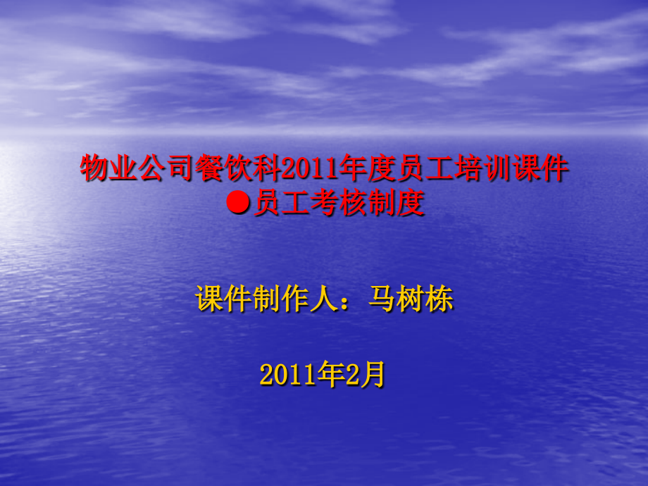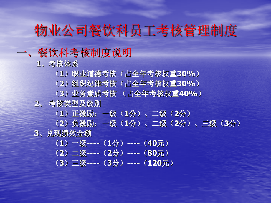 单击此处编辑母版标题样式,单击此处编辑母版文本样式,第二级,第三级,第四级,第五级,#,物业公司餐饮科,2011,年度员工培训课件员工考核制度,课件制作人:马树栋,2011,年,2,月,物业公司餐饮科员工考核管理制度,一、餐饮科考核制度说明,1,、考核体系,(,1,)职业道德考核(占全年考核权重,30%,),(,2,)组织纪律考核(占全年考核权重,30%,),(,3,)业务素质考核(占全年考核权重,40%,),2,、考核类型及级别,(,1,)正激励:一级(,1,分)、二级(,2,分),(,2,)负激励:一级(,1,分)、二级(,2,分)、三级(,3,分),3,、兑现绩效金额,(,1,)一级,-,(,1,分),-,(,40,元),(,2,)二级,-,(,2,分),-,(,80,元),(,3,)三级,-,(,3,分),-,(,120,元),二、员工考核细则一、职业道德考核,(,30%,),负激励,一级,带醉意上班的,带不良情绪上班的,对同事讲粗话的,不配合领导工作,有欺骗、隐瞒行为的,与同事吵架态度恶劣的,对待新员工态度不友善有欺辱行为的,滞留上级命令或下级信息的,对本职工作不负责任随便做答,在公共区域大声喧哗、追逐打闹、勾肩搭背的,工作中弄虚作假,欺骗他人的,质检或检查发现问题经指明后整改不及时不彻底的,设备、设施出现故障不及时上报维修尚未造成影响工作的,发现餐厅物品丢失、损坏上报不及时的,班后未关闭水、电、气快关的造成能源浪费的,二级,无故拒绝上级领导检查的,紧急情况下不服从领导安排的,玩忽职守,违反操作流程造成人身伤害或设施、设备损坏等事故的,在突发事件及紧急情况下临阵脱逃或坐视不管的,因人为原因造成煤气泄漏、触电、发生火灾的,编造、传播谣言损坏他人形象和名誉的,三级,聚众闹事、煽动及参与斗殴或煽动员工怠工、罢工等活动的,冒充上级领导签字的,严重失职、营私舞弊,给餐厅造成重大经济损失的,正激励,一级,得到公司员工书面表扬的,拾物、拾金不昧价值在百元以上的,被评为餐饮科月度,“,活动之星,”,称号的,工作积极起到模范带头作用的,发现事故或突发事件苗头及时采取措施,防止重大事故发生的,工作中文明、礼貌、尽职尽责的,团结协作、顾全大局、密切配合、服从上级指挥的,二级,因工作需要带病上岗、加班加点的,在节假日值班认真负责的,工作积极,主动帮带他人,效果突出的,积极管理,坚持原则,纠正不良行为效果突出的,遇有突发事件勇于负责处理得当的,在工作中积极与其他部门协调或密切配合工作成绩突出的,二、组织纪律考核(,30%,),负激励,一级,上下班或参加学习、培训时不按时签到、签退的,上班、参加学习、培训或会议时迟到,10-20,分钟的,不按规定交接班的,未经允许私自调换班次,尚未对工作构成影响的,班前会上不认真听取领导的工作总结和工作安排,尚未影响正常工作的,参加培训、学习或会议时不认真听讲,做小动作,坐姿不正打瞌睡或玩手机,电话铃微调至静音的,委托他人签退、签到的,未经批准私自早退的,无故脱岗,20,分钟的,不按规定请、销假的,二级,上班、参加培训学习或会议时迟到,1,小时以上的,无故脱岗,2,小时以上的,未经批准不参加统一组织的培训、学习、会议及其他活动的,在会场上大声喧哗不遵守会场纪律的,三级,数次并犯一级或二级条例的,不服从上级分配或随意顶撞领导且态度恶略的,一月内非连续旷工,3,天者(旷工,1,天,扣三天工资,具体按当月实际考核出勤为准),正激励,一级,一个月内无请假、旷工记录的,一个月内无迟到、早退的,积极参加各项学习、培训、会议的,二级,一个月内加班在,1-3,天的,三、业务素质考核(,40%,),负激励,一级,不讲个人卫生,头发凌乱,面容、双手不整洁、指甲过长的,不按规定化妆的,上班时无故不穿工装或工装不整洁的,按规定操作但未达到质量标准尚未影响正常工作的,上交资料内容不全或上交不及时的,班前物品准备不齐全尚未影响正常工作的,不遵守员工更衣柜管理规定的,工作时间在后厨抽烟的,随地吐痰、乱仍垃圾杂物等破坏公共卫生的,物品盘点不清且提供数据不真实的,管理不到位各种表格遗失或不按规定运作的,不按规定进行班前物品准备和班后收尾的,日常培训考核虽经补考仍未及格的未经批准将闲杂人员带入后厨的,菜单书写不整齐的、不清楚的,原材料综合利用不到位造成浪费的,对机械设备保养不到位的,二级,未及时完成上级工作安排的,菜品不达不到质量标准被引起员工投诉的,不按照食品卫生安全管理规定进行操作尚未造成严重问题的,违规操作造成设备损坏严重的,三级,不按照食品卫生安全管理规定进行操作引起员工食物轻度中毒的,正激励,一级,积极参加统一组织的技能大赛活动等活动成绩在前前三名的,在工作中不断优化工作流程、采取措施经应用取得重大成效的,对工作或管理制度提出合理化建议经采纳实行后有显著效果的,积极钻研业务或提出合理化建议的,所负责班组被评为科室月度先进班组的,在,宝丰能源报,上发表文章的,参加培训、学习考核成绩在前两名的,积极上进坚持学习钻研业务知识成绩显著的,二级,工作效率高,提前完成重大工作任务的,积极采取措施综合成本降低的,设施、设备保养良好无损坏或维修记录,的,谢谢合作!,