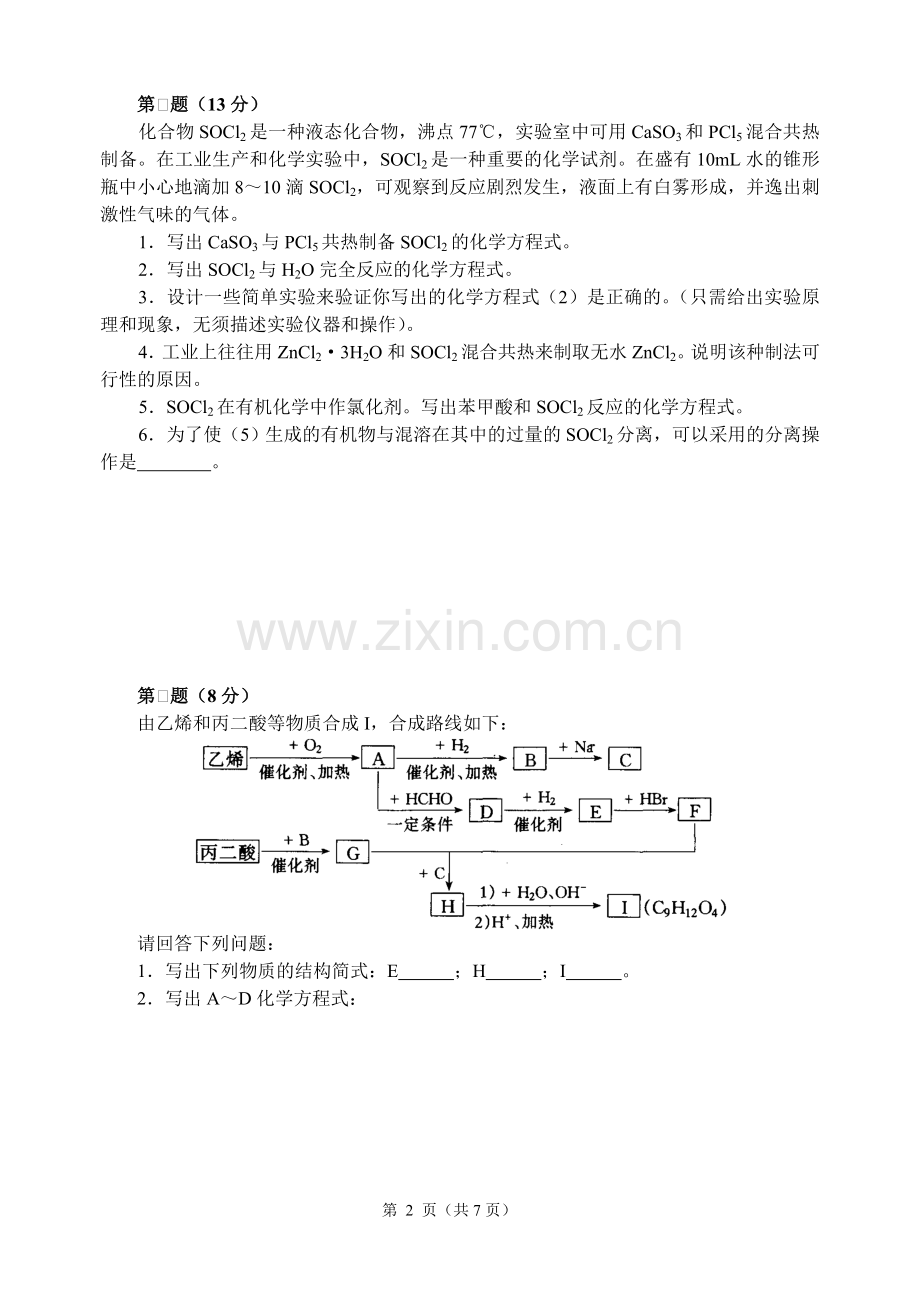 1.写出CaSO3与PCl5共热制备SOCl2的化学方程式。