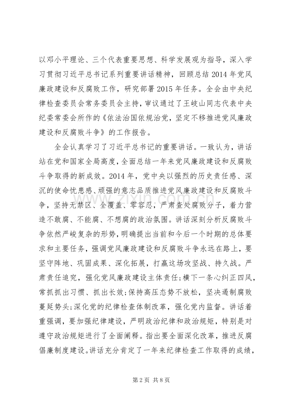 全会总结2014年党风廉政建设和反腐败工作,认为过去的一年,在党中央坚强领导下,党风廉政建设和反腐败斗争不断深入,四风问题和腐败蔓延势头得到一定遏制,严肃查处周永康、徐才厚、令计划、苏荣等严重违纪案件,深得党心民心。各级纪检监察机关聚焦中心任务,强化监督执纪问责,转职能、转方式、转作风,清理省一级纪委参与的议事协调机构,解决职能越位、错位、不到位问题。坚持立行立改,扎实推进纪律检查体制改革,落实党风廉政建设主体责任。完成对31个省区市和新疆生产建设兵团巡视全覆盖,对19个部门和中央企事业单位开展专项巡视,巡视强度力度全面提升、效果显著。推进双重领导体制具体化、程序化、制度化。深化派驻机构改革,强化党内监督。严明政治纪律、组织纪律,坚持巩固深化落实中央八项规定精神成果,持之以恒纠正四风。加大纪律审查力度,处理好树木与森林的关系,治病树、拔烂树,形成震慑,深入开展国际追逃追赃,保持高压态势。严格教育监督管理,以铁的纪律建设过硬纪检监察队伍。