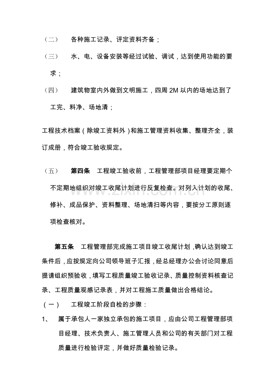 (五) 第四条 工程竣工验收前,工程管理部项目经理要定期个不定期地组织对竣工收尾计划进行反复检查。对列入计划的收尾、修补、成品保护、资料整理、场地清扫等内容,要按分工原则逐项检查核对。