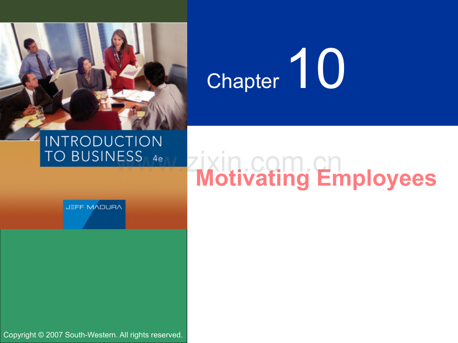 Copyright 2007 South-Western.All rights reserved.Chapter 10Motivating EmployeesMotivatingEmployeesCopyright 2007 South-Western.All rights reserved.Learning ObjectivesMotivatingEmployeesSatisfactionIncrease ValueDisgruntledTheoriesMotivatingEmployeesCopyright 2007 South-Western.All rights reserved.The Key Decisions in Running a BusinessMotivatingEmployeesCopyright 2007 South-Western.All rights reserved.Value of MotivationIncrease ValueTheoriesDisgruntledSatisfactionMotivatingEmployeesCopyright 2007 South-Western.All rights reserved.Hawthorne StudiesIncrease ValueTheoriesDisgruntledSatisfactionMotivatingEmployeesCopyright 2007 South-Western.All rights reserved.Hierarchy of NeedsIncrease ValueTheoriesDisgruntledSatisfactionMotivatingEmployeesCopyright 2007 South-Western.All rights reserved.Herzbergs TheoryIncrease ValueTheoriesDisgruntledSatisfactionMotivatingEmployeesCopyright 2007 South-Western.All rights reserved.Herzbergs TheoryIncrease ValueTheoriesDisgruntledSatisfactionMotivatingEmployeesCopyright 2007 South-Western.All rights reserved.Expectancy TheoryIncrease ValueTheoriesDisgruntledSatisfactionWant an“A”Grade?Exams free questionsGrading ScaleA=99.9%B=99.9-99.8%C=99.8-99.7%D=99.7-99.6%F=99.6%No One Ever PassedMotivatingEmployeesCopyright 2007 South-Western.All rights reserved.Equity TheoryIncrease ValueTheoriesDisgruntledSatisfactionMotivatingEmployeesCopyright 2007 South-Western.All rights reserved.Reinforcement TheoryIncrease ValueTheoriesDisgruntledSatisfactionMotivatingEmployeesCopyright 2007 South-Western.All rights reserved.Motivational GuidelinesIncrease ValueTheoriesDisgruntledSatisfactionMotivatingEmployeesCopyright 2007 South-Western.All rights reserved.Disgruntled EmployeesIncrease ValueTheoriesDisgruntledSatisfactionMotivationDisciplineTerminationMotivatingEmployeesCopyright 2007 South-Western.All rights reserved.Job EnrichmentIncrease ValueTheoriesDisgruntledSatisfactionMotivatingEmployeesCopyright 2007 South-Western.All rights reserved.Compensation ProgramsIncrease ValueTheoriesDisgruntledSatisfactionMeritAcross-the-boardIncentiveMotivatingEmployeesCopyright 2007 South-Western.All rights reserved.Compensation PlanIncrease ValueTheoriesDisgruntledSatisfactionEmployee GoalsAchievableEmployee InputBusiness GoalsMotivatingEmployeesCopyright 2007 South-Western.All rights reserved.Security&SchedulesIncrease ValueTheoriesDisgruntledSatisfactionJob SecurityFlextimeCompressed WorkweekJob SharingMotivatingEmployeesCopyright 2007 South-Western.All rights reserved.Employee InvolvementIncrease ValueTheoriesDisgruntledSatisfactionJob RotationTeamworkJob EnlargementEmpowermentOpen-BookParticipative