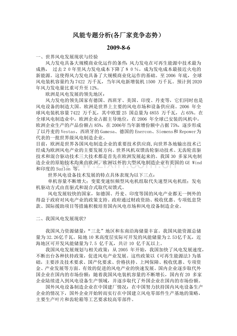我国风电发展规划与相关政策:从2005 年开始,我国加快了风电发展速度,不断出台各种扶持政策,促进风电产业发展。这些政策以《可再生能源法》为基础,主要涉及技术要求、国产化要求、价格扶持、上网保障、税收优惠、专项资金、产业发展等方面。有效的促进的风电产业的快速发展。国内企业逐步取代外国企业在国内的市场份额:随着我国风电装机容量的不断增长,国内有20 多家企业陆续进入到风电设备生产领域,并逐步取代了外国企业在国内的市场份额。