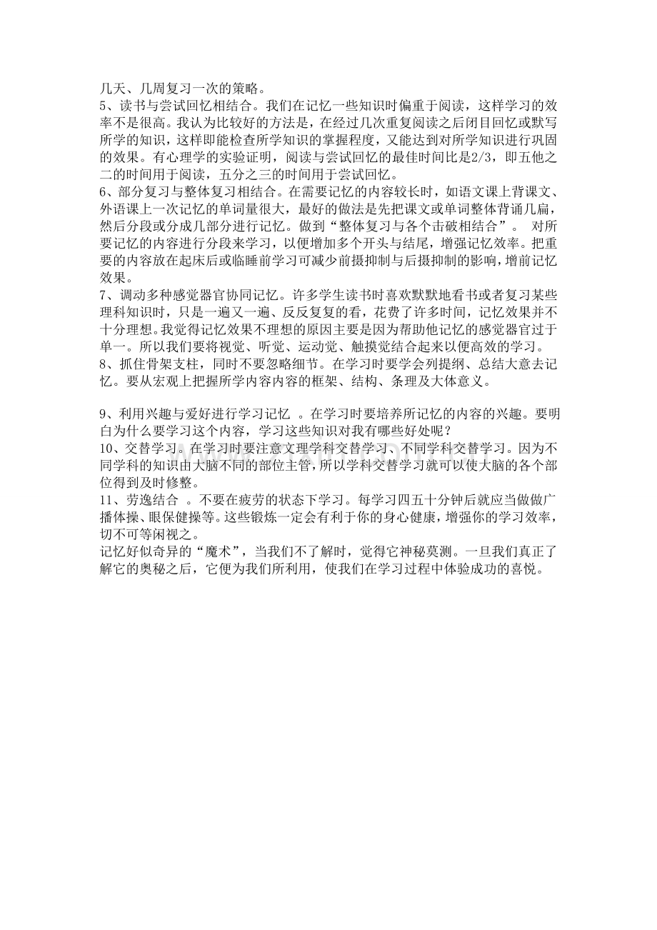 11、 劳逸结合 。不要在疲劳的状态下学习。每学习四五十分钟后就应当做做广播体操、眼保健操等。这些锻炼一定会有利于你的身心健康,增强你的学习效率,切不可等闲视之。 记忆好似奇异的“魔术”,当我们不了解时,觉得它神秘莫测。一旦我们真正了解它的奥秘之后,它便为我们所利用,使我们在学习过程中体验成功的喜悦。