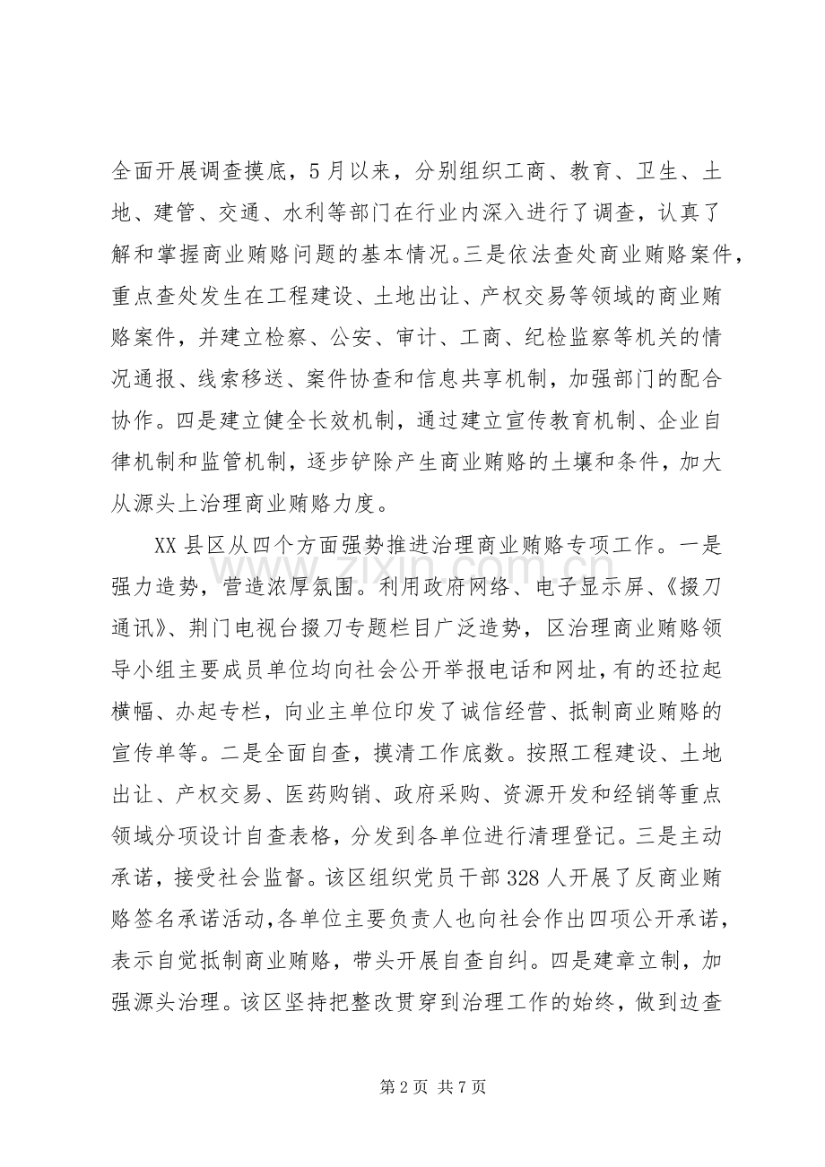 XX县区采取有力措施,扎实推进治理商业贿赂专项工作。一是切实加强组织领导,成立了区治理商业贿赂领导小组,下发了《治理商业贿赂工作实施方案》,召开动员大会进行安排部署,并组织区治理商业贿赂领导小组成员和教育、财政、卫生等19个重点部门的班子成员、中层干部以及二级单位负责人近200人聆听了区检察院关于“抵制商业贿赂,维护公平正义”的专题法制讲座。二是认真开展自查自纠,通过查思想、查行为和查制度,全面开展调查摸底,5月以来,分别组织工商、教育、卫生、土地、建管、交通、水利等部门在行业内深入进行了调查,认真了解和掌握商业贿赂问题的基本情况。三是依法查处商业贿赂案件,重点查处发生在工程建设、土地出让、产权交易等领域的商业贿赂案件,并建立检察、公安、审计、工商、纪检监察等机关的情况通报、线索移送、案件协查和信息共享机制,加强部门的配合协作。四是建立健全长效机制,通过建立宣传教育机制、企业自律机制和监管机制,逐步铲除产生商业贿赂的土壤和条件,加大从源头上治理商业贿赂力度。