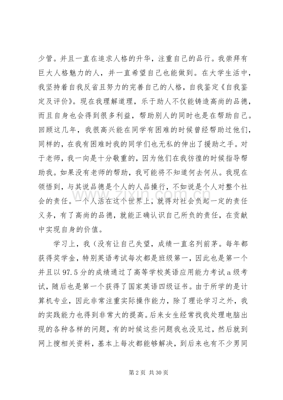 大学三年,塑造了一个健康、充满自信的我,自信来自实力,但同时也要认识到,眼下社会变革迅速,对人才的要求也越来越高,社会是在不断变化、发展的,要用发展的眼光看问题,自身还有很多的缺点和不足,要适应社会的发展,得不断提高思想认识,完善自己,改正缺点。作为一名it人士,所受的社会压力将比其他行业更加沉重,要学会学习,学会创新,学会适应社会的发展要求篇三:大学生最好最全最新的自我鉴定自我评价自荐书推荐表