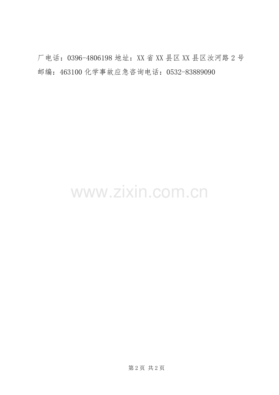 。本品或其容器依当地法规处置。请参阅化学品安全技术说明书供应商:中国平煤神马集团蓝天化工股份有限公司遂平化工厂电话:0396-4806198地址:XX省XX县区XX县区汝河路2号邮编:463100化学事故应急咨询电话:0532-83889090