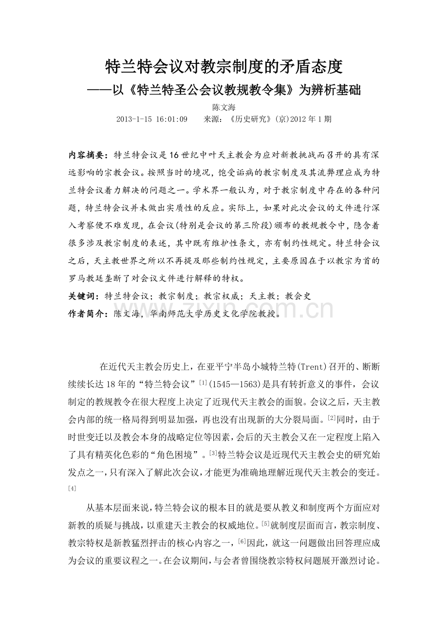 关键词:特兰特会议;教宗制度;教宗权威;天主教;教会史