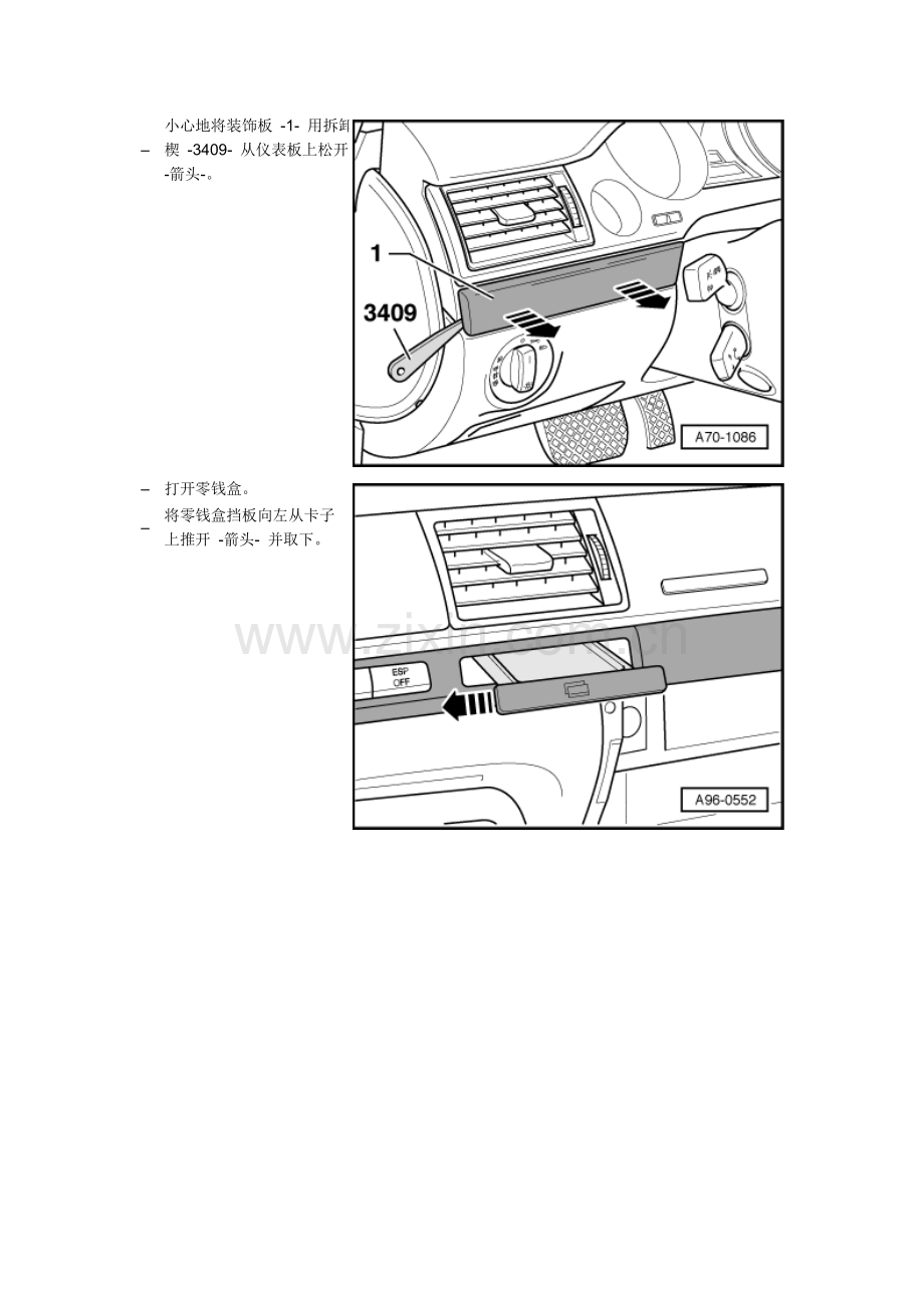 小心地将装饰板 -1- 用拆卸楔 -3409- 从仪表板上松开 -箭头-。