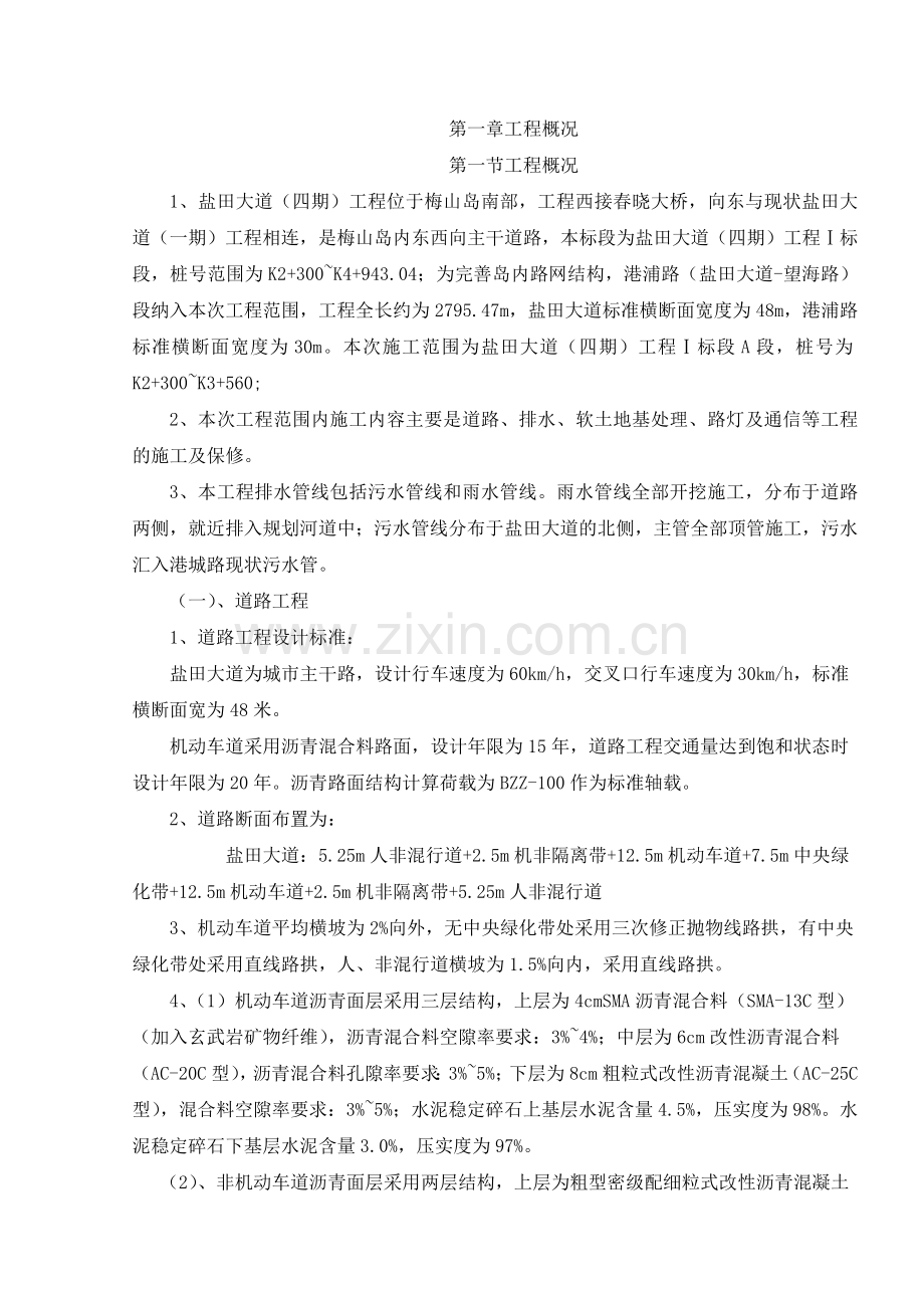 1、盐田大道(四期)工程位于梅山岛南部,工程西接春晓大桥,向东与现状盐田大道(一期)工程相连,是梅山岛内东西向主干道路,本标段为盐田大道(四期)工程Ⅰ标段,桩号范围为K2+300~K4+943.04;为完善岛内路网结构,港浦路(盐田大道-望海路)段纳入本次工程范围,工程全长约为2795.47m,盐田大道标准横断面宽度为48m,港浦路标准横断面宽度为30m。本次施工范围为盐田大道(四期)工程Ⅰ标段A段,桩号为K2+300~K3+560;