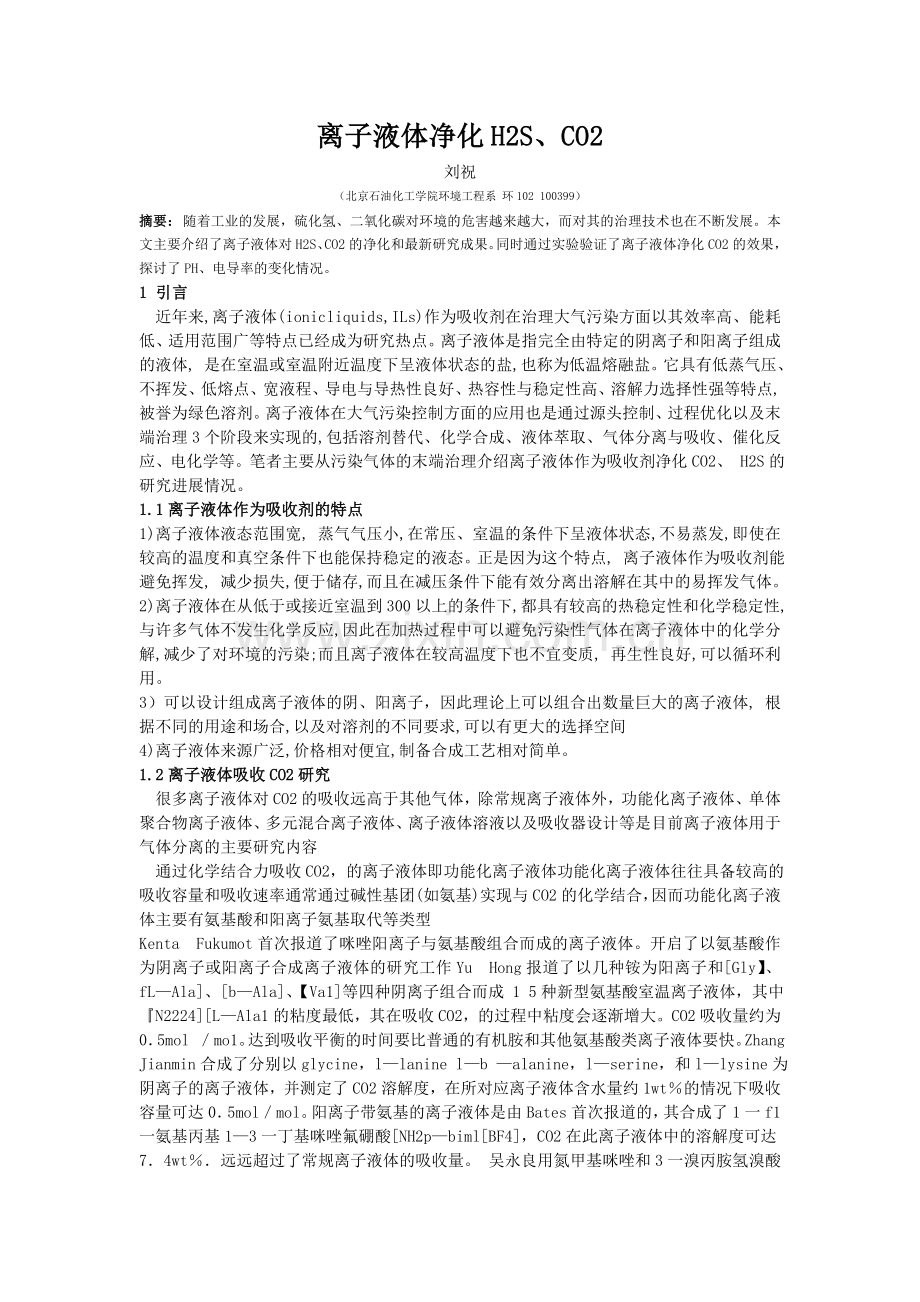 [1] 高亮、郭斌、段二红 离子液体在净化 C O 2 , S O 2 , H 2 S 方面的研究进展,河北工业科技,2011年9月,第5期