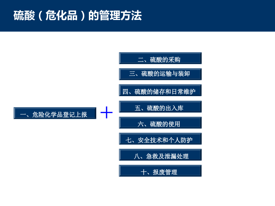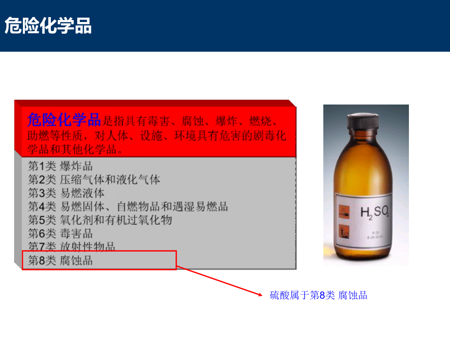 单击此处编辑母版标题样式,单击此处编辑母版文本样式,第二级,第三级,第四级,第五级,*,危险化学品,第1类 爆炸品,第2类 压缩气体和液化气体,第3类 易燃液体,第4类 易燃固体、自燃物品和遇湿易燃品,第5类 氧化剂和有机过氧化物,第6类 毒害品,第7类 放射性物品,第8类 腐蚀品,危险化学品,是指具有毒害、腐蚀、爆炸、燃烧、助燃等性质,对人体、设施、环境具有危害的剧毒化学品和其他化学品。,硫酸属于第8类 腐蚀品,硫酸(危化品)的管理方法,二、硫酸的采购,三、硫酸的运输与装卸,四、硫酸的储存和日常维护,五、硫酸的出入库,六、硫酸的使用,八、急救及泄漏处理,十、报废管理,七、安全技术和个人防护,一、危险化学品登记上报,一、危险化学品登记上报,1、上海安监局要求各危险化学品生产、使用等单位需对本单位危化品各类信息进行上报,(需在近期完成),二、硫酸(危化品)的采购,1、,采购部应建立企业,危险化学品使用汇总清单,,且每年更新一次。各危险化学品的部门应建立本单位的,危险化学品使用清单,,且每年更新一次。,2、,危险化学品的采购必须从取得危险化学品生产许可证或者经营许可证的企业或供应商中进行采购。,查看有效期是否到期?,查看经营的危化品是否和实物名称一致?,二、硫酸(危化品)的采购,3,、采购部负责督促供应商提供危险化学品的“化学品安全技术说明书(,MSDS,)”和“化学品安全标签”;危险化学品的保管单位,必须查验与该物品相一致的,化学品安全技术说明书(,MSDS,),和,化学品安全标签,。,采购部购买的所有化学品须有MSDS,危险化学品包装上须有安全标志,五、,硫酸(危化品)的出入库,1、入库,1)危化品入库时,公司安保部门负责人、危化品管理员和危化品仓储账目管理员应该到场。,2)公司安保负责人负责危化品卸车入库时的安全组织工作,危化品管理员负责危化品卸车入库时的安全技术指导和监督工作。安保负责人和危化品管理员应对待入库的危化品进行检查、验收,并及时纠正违章行为。,3)危化品入库期间,公司主管生产、安全、工艺的负责人必须有一人当值。,4)危化品入库时由安保负责人、危化品管理员和仓储账目管理员按合同内容进行检查验收、登记,填写入库单。验收内容包括:a.商品数量;b.包装;c.危险标志;,d.合格证或检验报告。经核对后方可入库,当商品性质未弄清时不得入库。,5)危化品入库期间,公司保安应挂出机动车辆绕行警示牌,与运输危化品无关的机动车辆不得驶过危化品库15m范围内的厂内道路。,6)进入危化品库区作业的机动车辆,必须安装机动车排气火花熄灭器。,2、出库,1)危化品出库前均应按领料单进行检查核对,核对内容包括:,a.数量;b.包装;c.危险标志,2)进入危化品储存区域的人员,不得带入火种。,3)装卸、搬运危化品时应按有关规定进行,做到轻装、轻卸。严禁摔、碰、撞击、拖拉、倾动和滚动。,4)装卸对人身有害及腐蚀性的物品时,操作人员应根据危险性,穿戴相应的防护用品。,5)不得用同一车辆运输互为禁忌的物料。,6)修补、换装、清扫、装卸易燃、易爆物料时,应使用不产生火花的铜制、合金制或其他工具。,7)危化品的出入库须有台帐记录,每月必须进行盘帐,做到帐、卡、物相符。,1、使用危化品的装置,应根据其种类、性能和使用过程中的火灾危害及毒害程度,设置相应的排风、,通风、防火、防爆、防尘防毒、泄压、降温、防潮、避雷、阻止回火、导除静电、紧急排放、隔离操作,和自动报警等安全设施。,2、根据生产需要,可由生产车间存放的危化品,应规定存放时间、地点和最高允许存放量。,3、危化品使用场所操作人员必须正确穿戴专用防护用品和器具。如酸、碱作业岗位要戴眼镜,处理,问题时必须戴面罩。严禁用手直接接触危化品,工作结束后应更换工作服,清洗后方可离开作业场所。,4、不得在有危化品的场所饮食。危化品场所应备有一定数量的解毒药品(甘草含剂等)以备应急抢,救之用。,5、包装危化品的容器,必须存放于专用的场所,不使用时必须上锁。在使用前必须进行检查,消除,隐患。容器必须牢固、严密,并按照国家颁发的危险货物包装标志的规定,印贴专用的标志和物品,名称。,6、储存危化品的场所,其电气、动力设备、照明装置、仪表和开关等应根据危险物品的性质和国家,颁发的爆炸危险物品场所电气安全规程等规定,分别采用防爆或隔离措施。,7、输送液体物品,应采取防止泄露、消除静电的措施,输送固体氧化剂、易燃固体等应防止摩擦、,撞击。,8、危化品禁止使用明火加热,在操作过程中,若必须采用烟道气、有机热载体、电热或照明等加热,时,应采取严密隔离措施。,9、凡用于生产的煤气、有毒、有害气体、蒸汽、水等管道必须与生活用汽(水)管道分开。用途不,同的工作气体(液体)管道不应联通。,10、危化品使用过程中所产生的废水(气)、废渣和粉尘的排放必须符合国家有关规定的标准处理。,11、严禁用一级易燃液体洗刷机器设备、车辆部件和工作服等。,12、车间每次使用危化品,必须填写危化品使用情况记录单,由生产部门负责人核实并签名后,交,公司安保部门负责人复核并签名、备案。,六、,硫酸(危化品)的使用,1、改革工艺技术,并采用安全的生产条件,防止和减少有害物溢(逸)散。,2、以密闭、隔离、通风操作代替敞开式操作。,3